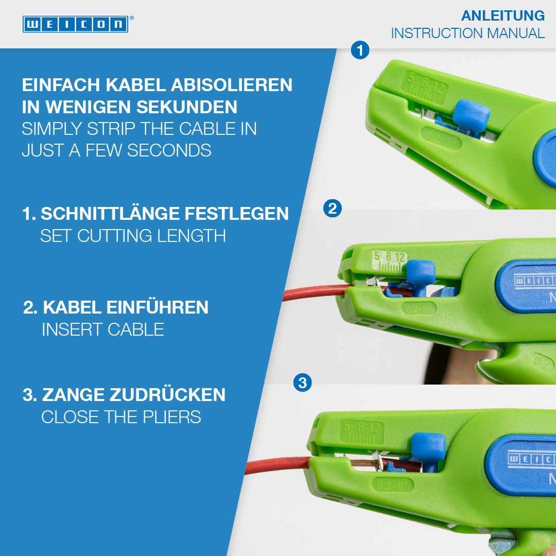 Nachhaltiges Abisolierwerkzeug I automatische Abisolierzange für alle gängigen flexiblen und massiven Leiter (0,2 - 6,0 mm²) | integrierter, gut zugänglicher Seitenschneider bis 2 mm Ø | genaues Arbeiten durch Längenanschlag (5 -12 mm) | Platzsparend durch Arretierung der Zange