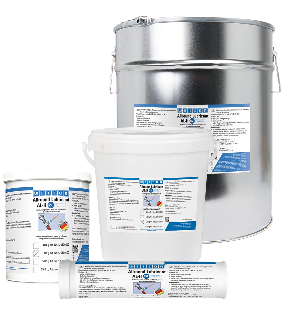 WEICON AL-H je vhodný pre valivé ložiská, klzné ložiská, kĺby, vretená, drážkované hriadele a lineárne vodiace systémy pri všetkých klzných rýchlostiach povolených pre mazanie mazivom. Vďaka špeciálnemu zloženiu a schváleniu NSF H1 je AL-H obzvlášť vhodný na použitie v potravinárskej technológii.