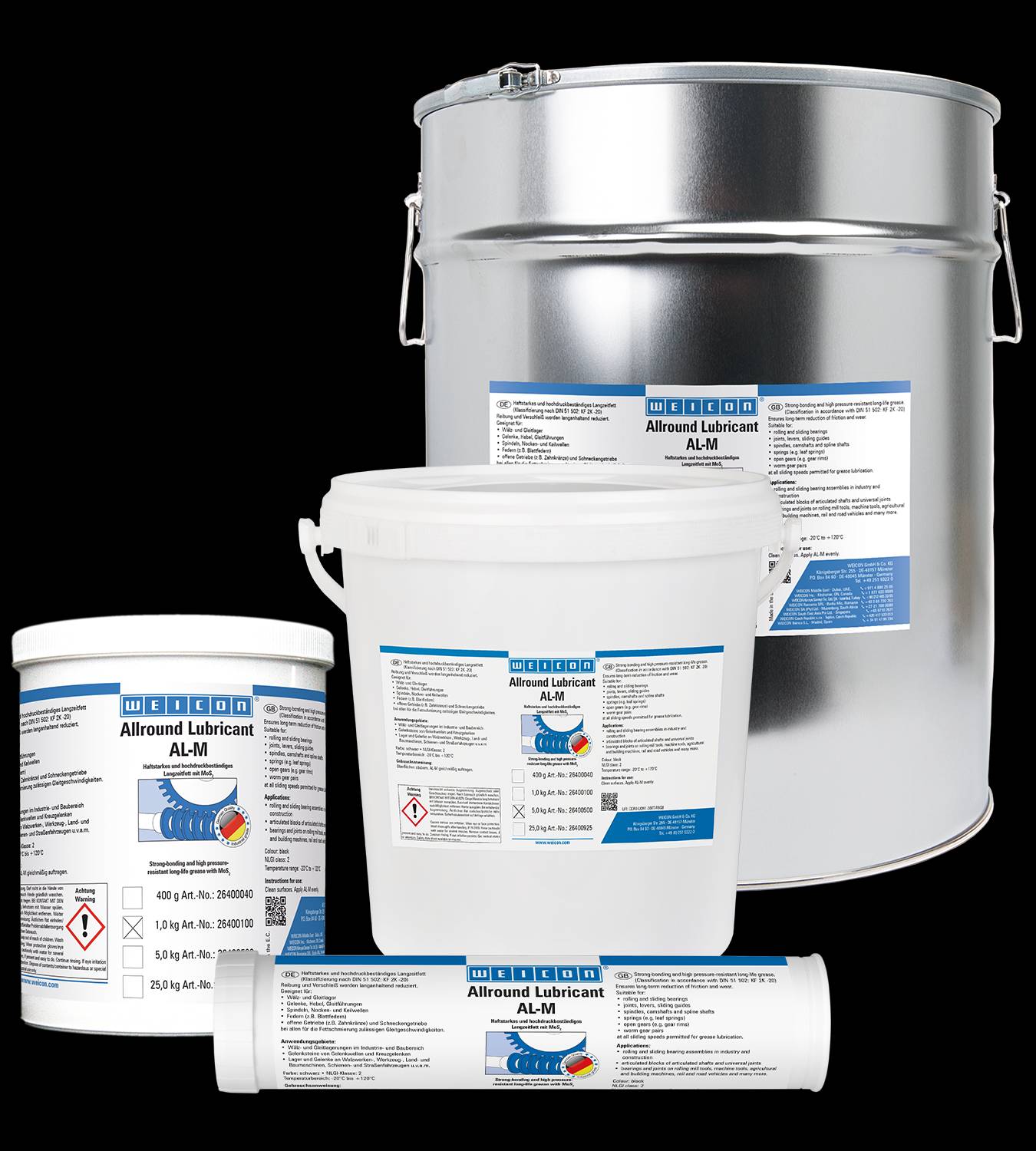 WEICON AL-M znižuje dlhodobé trenie a opotrebovanie a je vhodný pre valivé a klzné ložiská, kĺby, páky, klzné vedenia, vretená, vačkové hriadele a drážkované hriadele, pružiny, otvorené prevody, závitovkové prevody a pri všetkých klzných rýchlostiach povolených pre mazanie mazivom.