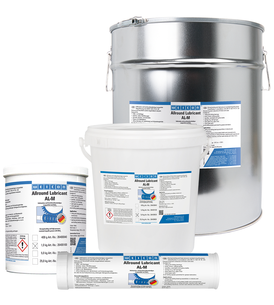 WEICON AL-M znižuje dlhodobé trenie a opotrebovanie a je vhodný pre valivé a klzné ložiská, kĺby, páky, klzné vedenia, vretená, vačkové hriadele a drážkované hriadele, pružiny, otvorené prevody, závitovkové prevody a pri všetkých klzných rýchlostiach povolených pre mazanie mazivom.