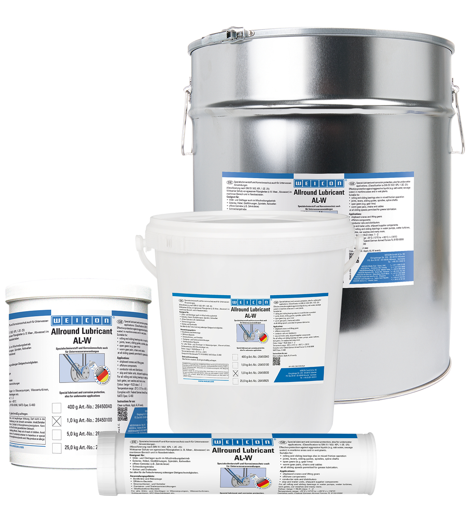 WEICON AL-W ponúka účinnú ochranu proti agresívnym kvapalinám, ako je morská alebo odpadová voda, v námornom sektore aj v mokrých prevádzkach. Mazivo je vhodné pre valivé a klzné ložiská aj v prevádzke so zmiešaným trením, kĺby, páky, klzné vedenia, vretená, drážkované hriadele, otvorené prevody, závitovkové prevody, reťaze a oceľové laná - pri všetkých klzných rýchlostiach povolených pre mazanie mazivom.