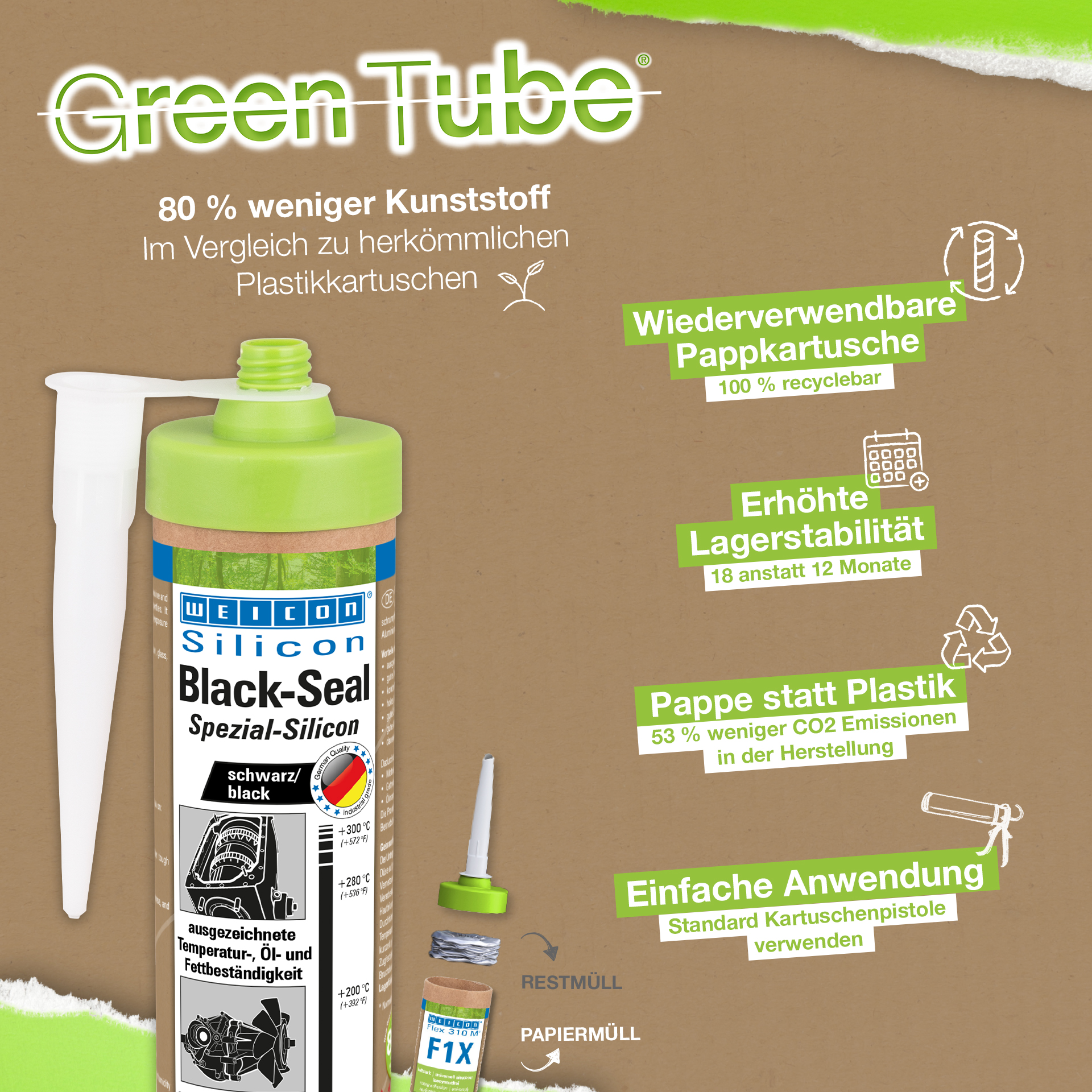 WEICON Black-Seal je odolný proti vysokým teplotám (+280 °C/+536 °F), neobsahuje rozpúšťadlá, je vysoko priľnavý, odolný voči tlaku, starnutiu a mimoriadne pružný (predĺženie pri pretrhnutí približne 500 %). Je vhodný na lepenie a tesnenie, kde sa vyžaduje obzvlášť vysoká odolnosť proti olejom a tukom. Výrobok možno použiť na kryty prevodoviek, ventilov a skríň, olejové vane a olejové čerpadlá, vodné čerpadlá, prevodovky a nápravy, príruby, nádrže a kontajnery a v mnohých ďalších oblastiach.