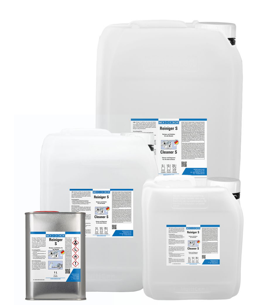 Čistič S odstraňuje mastnotu a nečistoty zo všetkých kovov, keramiky, skla a väčšiny plastov. Môže poškodiť povrch termoplastov, ako je PVC, plexisklo, polystyrén a jednoduché nátery. WEICON Čistič S sa rýchlo vyparuje bez zanechania zvyškov. WEICON Čistič S sa používa na čistenie a odmastnenie pred základným a vrchným náterom, na čistenie častí strojov, alebo pred aplikáciou iných produktov WEICON, kde by mastný podklad ovplyvnil výsledok. Čistič S je tiež výborným riešením na odmasťovanie elektromotorov a silne zaťažených elektronických zariadení.