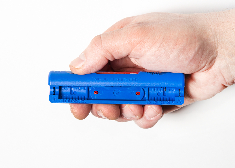 Coax-Stripper No. 2 umožňuje postupné odizolovanie všetkých bežných koaxiálnych káblov, káblov NYM a flexibilných káblov. Nie je potrebné nastavovať hĺbku rezu. Coax-Stripper No. 2 odblankuje koaxiálne káble s priemerom 4,8 - 7,5 mm, káble NYM 3 x 0,75 mm² a flexibilné káble 10 a 16 mm². Pri použití odstraňovača izolácie sa pri odstraňovaní izolácie vytvorí presný vzor rezu. Napríklad prvý plášť koaxiálneho kábla možno odstrániť nožom odblankovača na strane A. Vnútorný vodič sa potom odizoluje zo strany B.