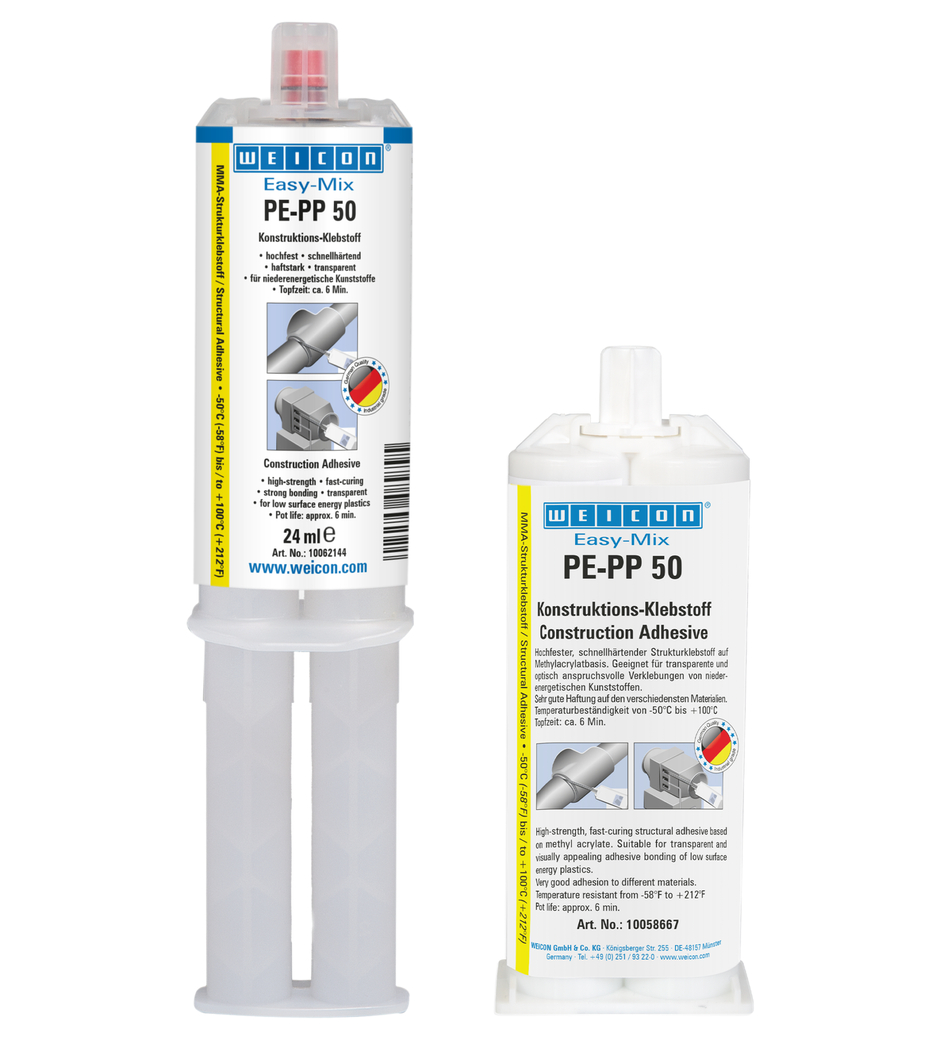 WEICON Easy-Mix PE-PP 50 je 2-zložkové konštrukčné lepidlo na báze metylakrylátu. Pre svoje transparentné vytvrdzovanie je vhodný najmä na opticky náročné, vysokopevnostné lepenie nízkoenergetických plastov, ako sú napr. PE, PP a TPE. Vďaka svojmu špeciálnemu zloženiu je lepidlo vhodné na spoje s nulovou medzerou a na lepenie materiálov s extrémne malými medzerami menej ako 0,2 mm. Konštrukčné lepidlo má rýchly vývoj pevnosti a vysokú konečnú pevnosť. Je nárazuvzdorný, odolný proti starnutiu, odolný proti chemikáliám a mierne tixotropný. PE-PP 50 má krátku dobu spracovateľnosti, 6 minút a manipulačnú pevnosť 12 minút. Spracováva sa systémom 1:1 a nie je potrebná žiadna predbežná úprava dielov, ktoré sa majú lepiť, pretože lepidlo má integrovaný Primer. Na spracovanie produktov Easy-Mix v 50 ml balení je potrebná dávkovacia pištoľ Easy-Mix D 50.