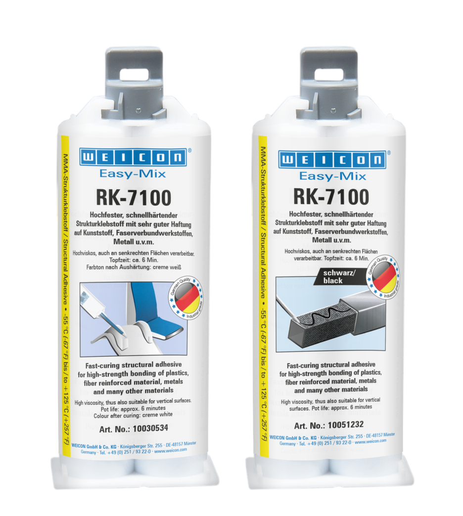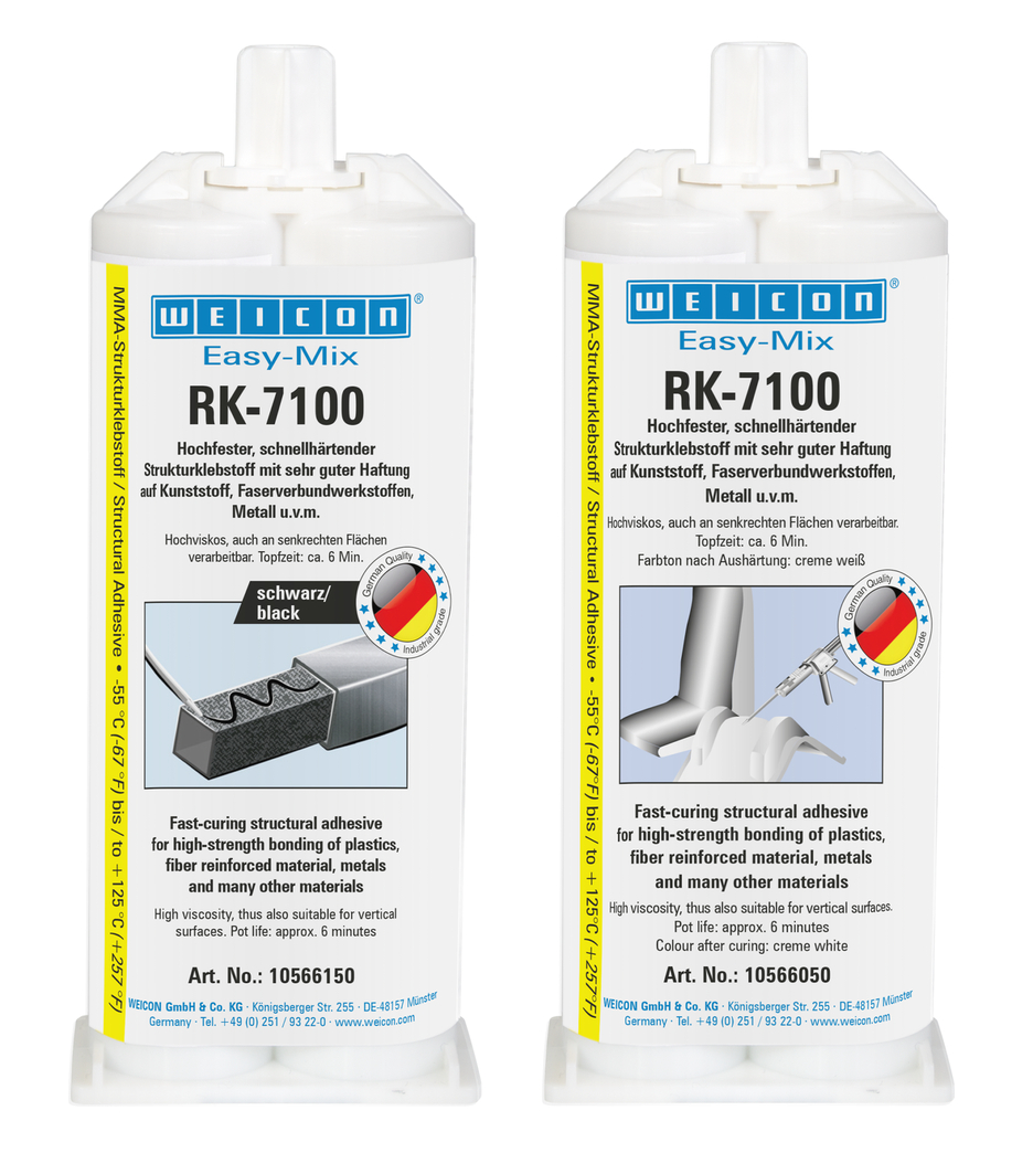 Akrylátové konštrukčné lepidlo WEICON RK-7100 spája mnohé materiály, ako sú plasty, kovy alebo keramika, s vysokou pevnosťou v ťahu, šmyku a odlupovaní, medzi sebou a navzájom Je obzvlášť vhodný na konštrukčné lepenie, kde sa vyžadujú vysokopevnostné spoje. Lepidlo je veľmi viskózne, a preto je vhodné aj na použitie na zvislých plochách. RK-7100 je univerzálne použiteľný a možno ho použiť napríklad v technológii výroby plastov, kovovýrobe, pri výrobe karosérií a vozidiel, strojárstve, elektrotechnike, pri výrobe modelov a foriem alebo pri výstavách a veľtrhoch. Na spracovanie produktov Easy-Mix v 50 ml balení je potrebná dávkovacia pištoľ Easy-Mix D 50.