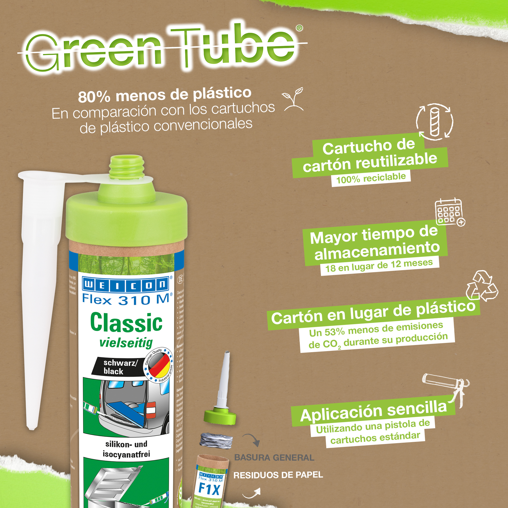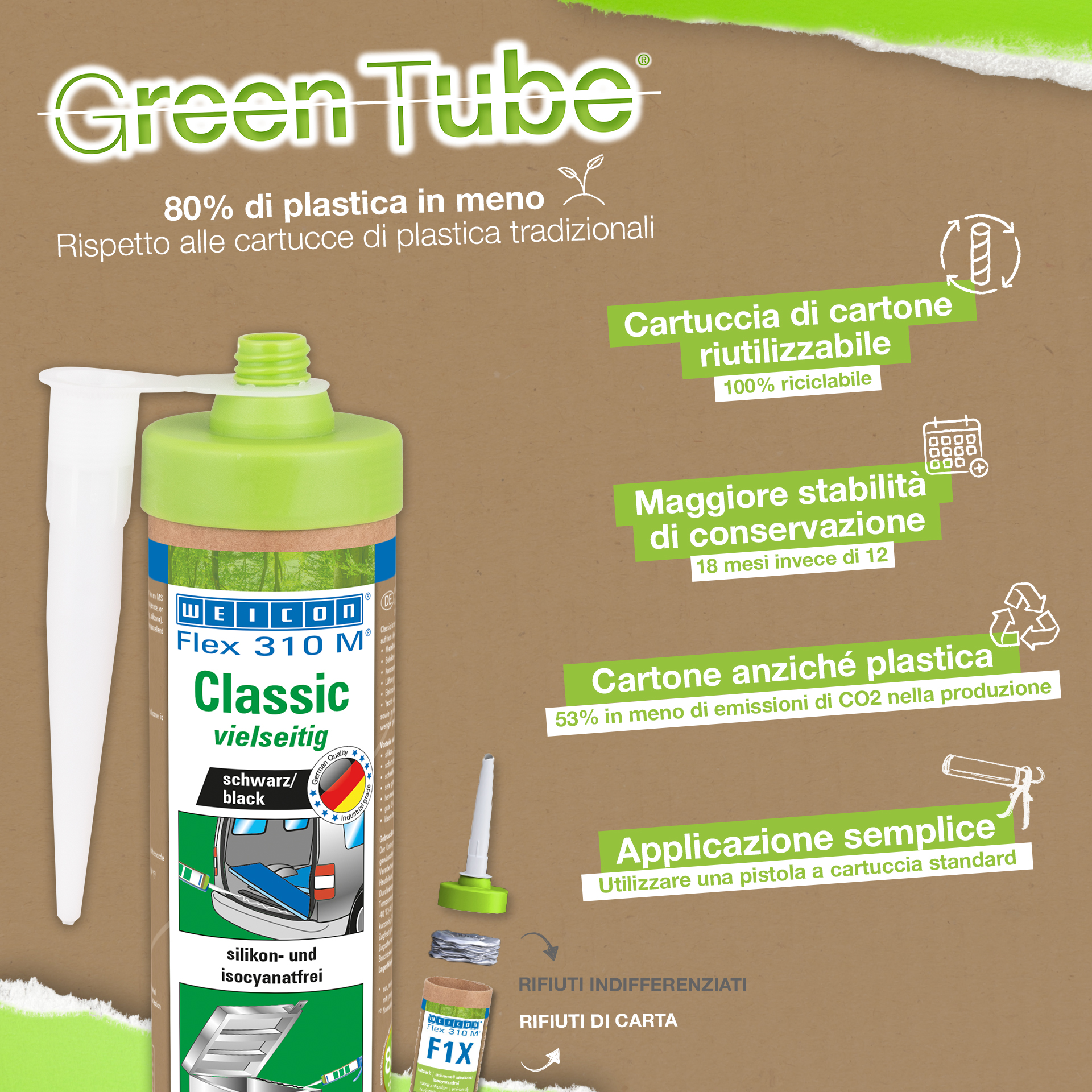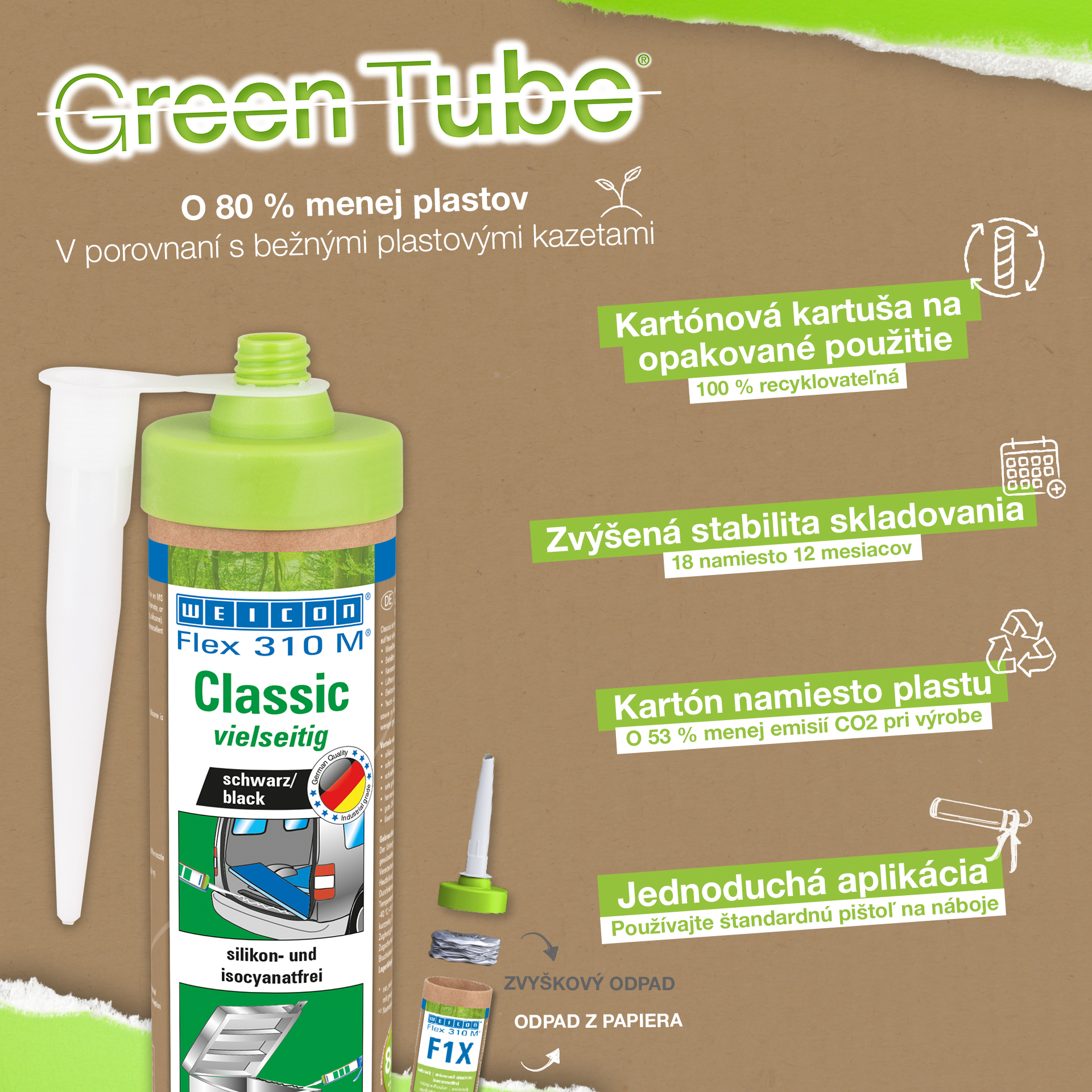 WEICON Flex 310 M Classic je vysoko priľnavý, možno ho prelakovať "mokré do mokrého", je brúsiteľný, má vynikajúcu odolnosť proti starnutiu a dobrú UV-stabilitu. Je odolný proti sladkej a slanej vode a neobsahuje silikón, izokyanát, halogény a rozpúšťadlá. Výrobok má certifikát ISEGA a môže sa používať ako lepidlo v potravinárskej technológii. Flex 310 M Classic je elastické lepidlo na báze MS-Polymérov a je vhodné na lepenie kovov, mnohých plastov, keramiky, dreva, skla a kameňa. Lepidlo a tmel možno použiť v kovovýrobe, pri výrobe kontajnerov a zariadení, vo výrobe karosérií, výrobe vozidiel a kontajnerov, vo ventilačnej a klimatizačnej technike, v elektrotechnickom priemysle, pri stavbe jácht a lodí a všade tam, kde nie je možné použiť silikóny alebo výrobky obsahujúce silikón.