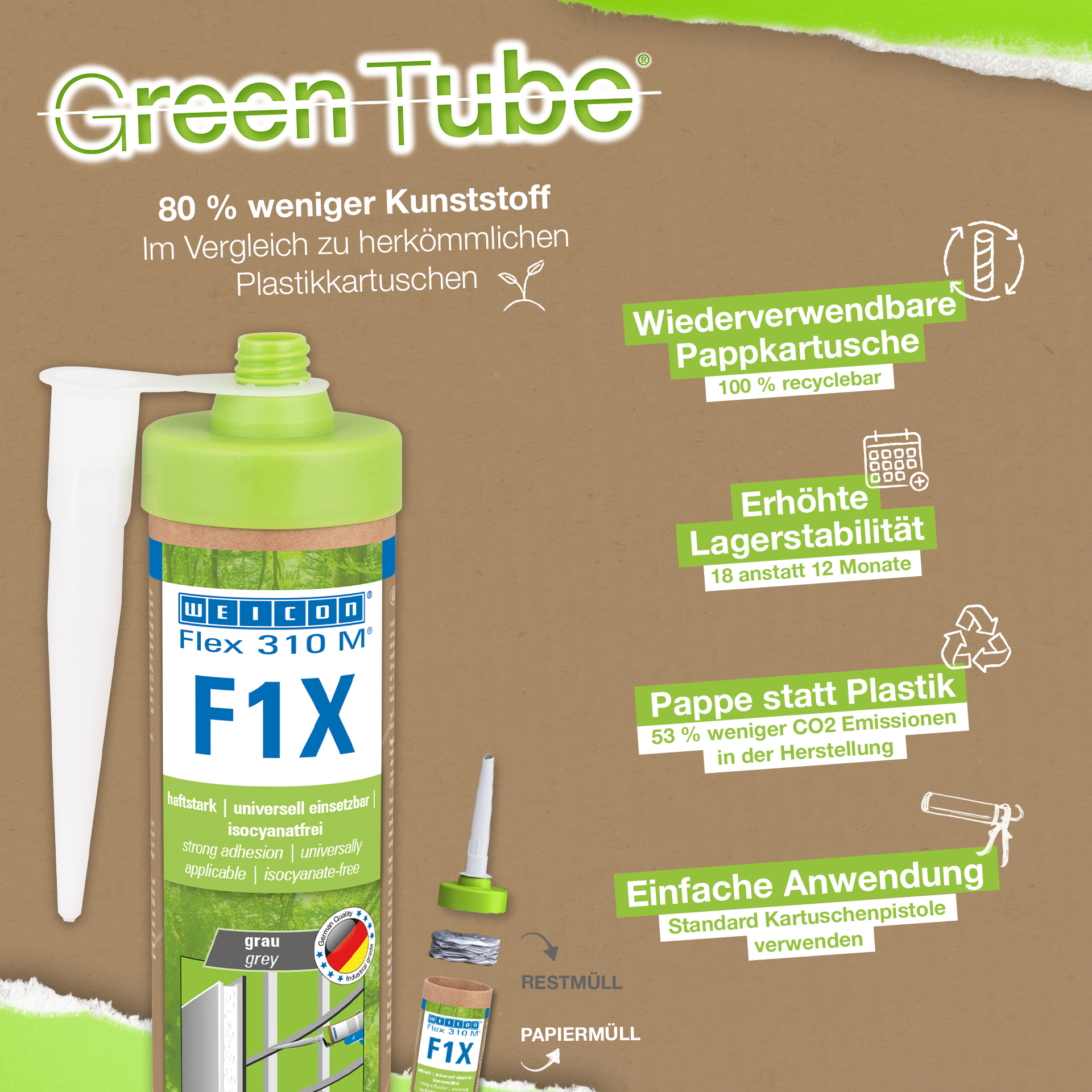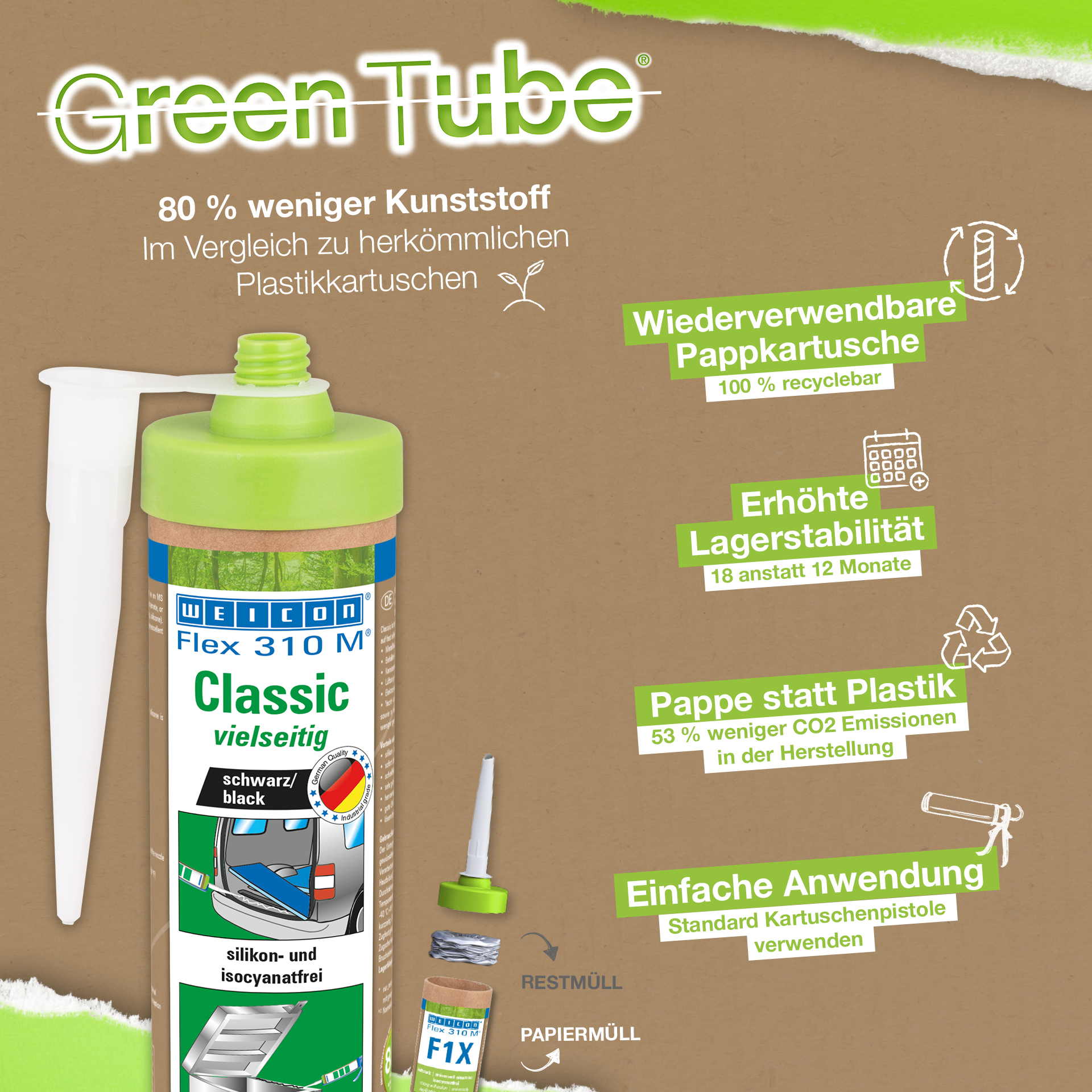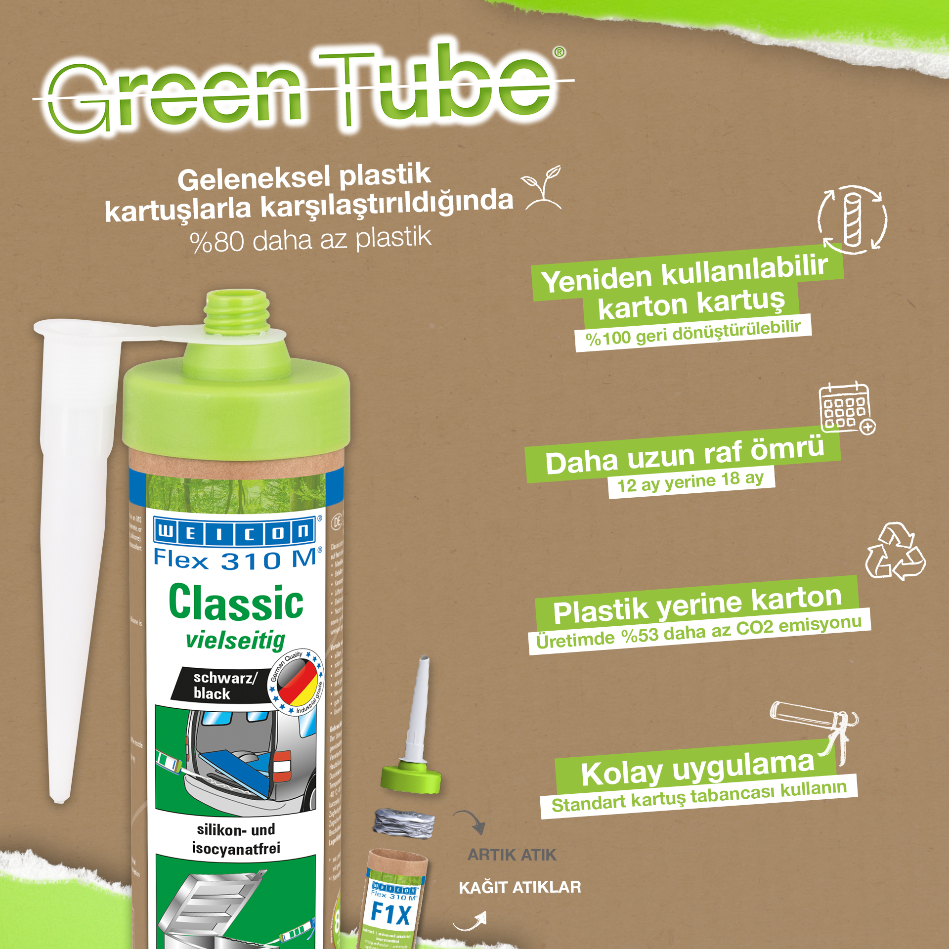 WEICON Flex 310 M Classic je vysoko priľnavý, možno ho prelakovať "mokré do mokrého", je brúsiteľný, má vynikajúcu odolnosť proti starnutiu a dobrú UV-stabilitu. Je odolný proti sladkej a slanej vode a neobsahuje silikón, izokyanát, halogény a rozpúšťadlá. Výrobok má certifikát ISEGA a môže sa používať ako lepidlo v potravinárskej technológii. Flex 310 M Classic je elastické lepidlo na báze MS-Polymérov a je vhodné na lepenie kovov, mnohých plastov, keramiky, dreva, skla a kameňa. Lepidlo a tmel možno použiť v kovovýrobe, pri výrobe kontajnerov a zariadení, vo výrobe karosérií, výrobe vozidiel a kontajnerov, vo ventilačnej a klimatizačnej technike, v elektrotechnickom priemysle, pri stavbe jácht a lodí a všade tam, kde nie je možné použiť silikóny alebo výrobky obsahujúce silikón.