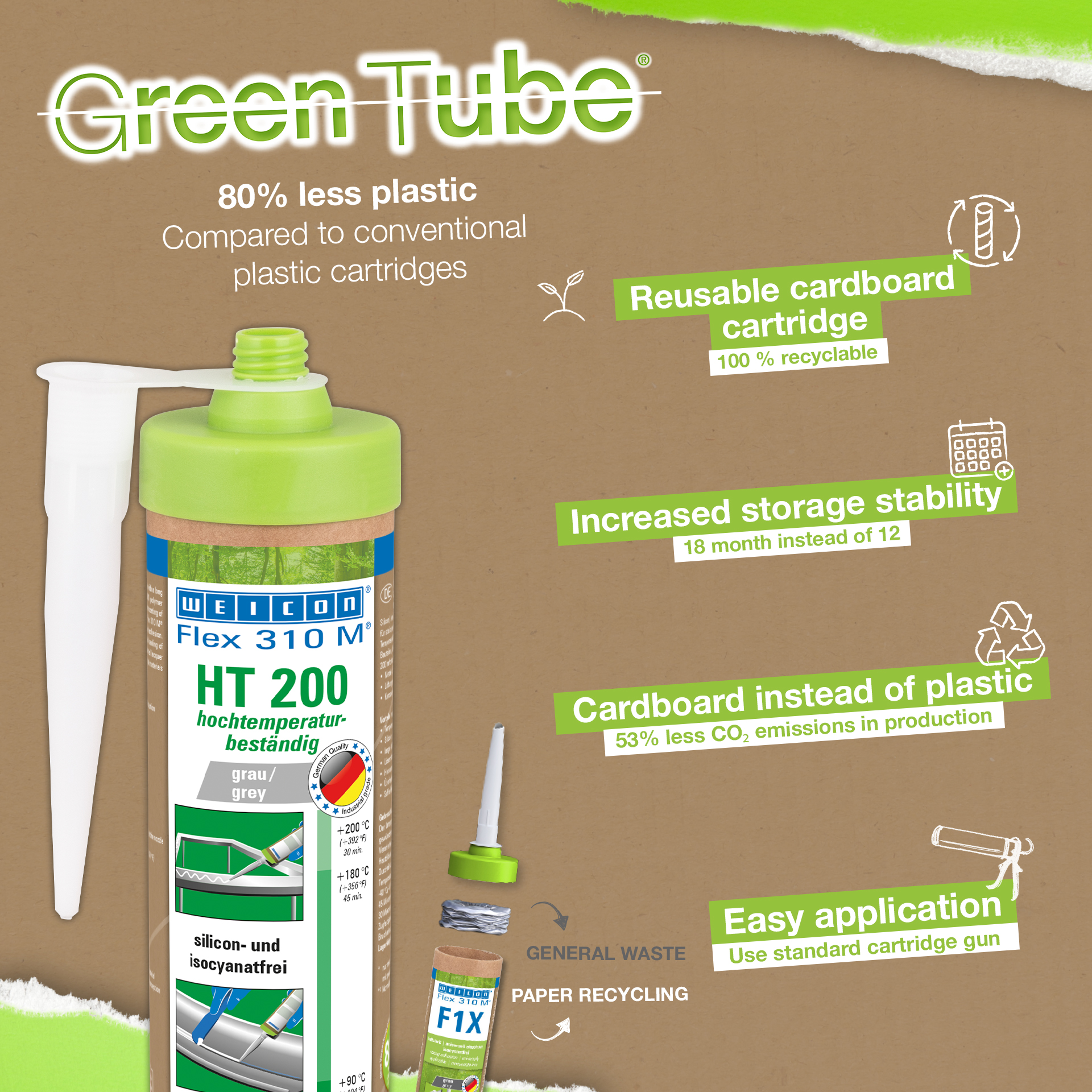 Vysoká teplotná odolnosť umožňuje lepenie a tesnenie komponentov, ktoré sa následne tepelne lakujú (práškové lakovanie). WEICON Flex 310 M HT 200 možno použiť v kovovýrobe, pri výrobe nádrží a prístrojov, vo ventilačnej a klimatizačnej technike, pri výrobe karosérií, kontajnerov, železničných vagónov a vozidiel. Flex 310 M HT 200 spĺňa požiadavky pre koľajové vozidlá tým, že je testovaný v súlade s DIN EN 45545-2 R1, R7, R17 HL3. WEICON Flex 310 M HT 200 je odolný proti vysokým teplotám, má vynikajúcu odolnosť proti starnutiu a neobsahuje silikón, izokyanát, halogén a rozpúšťadlá.