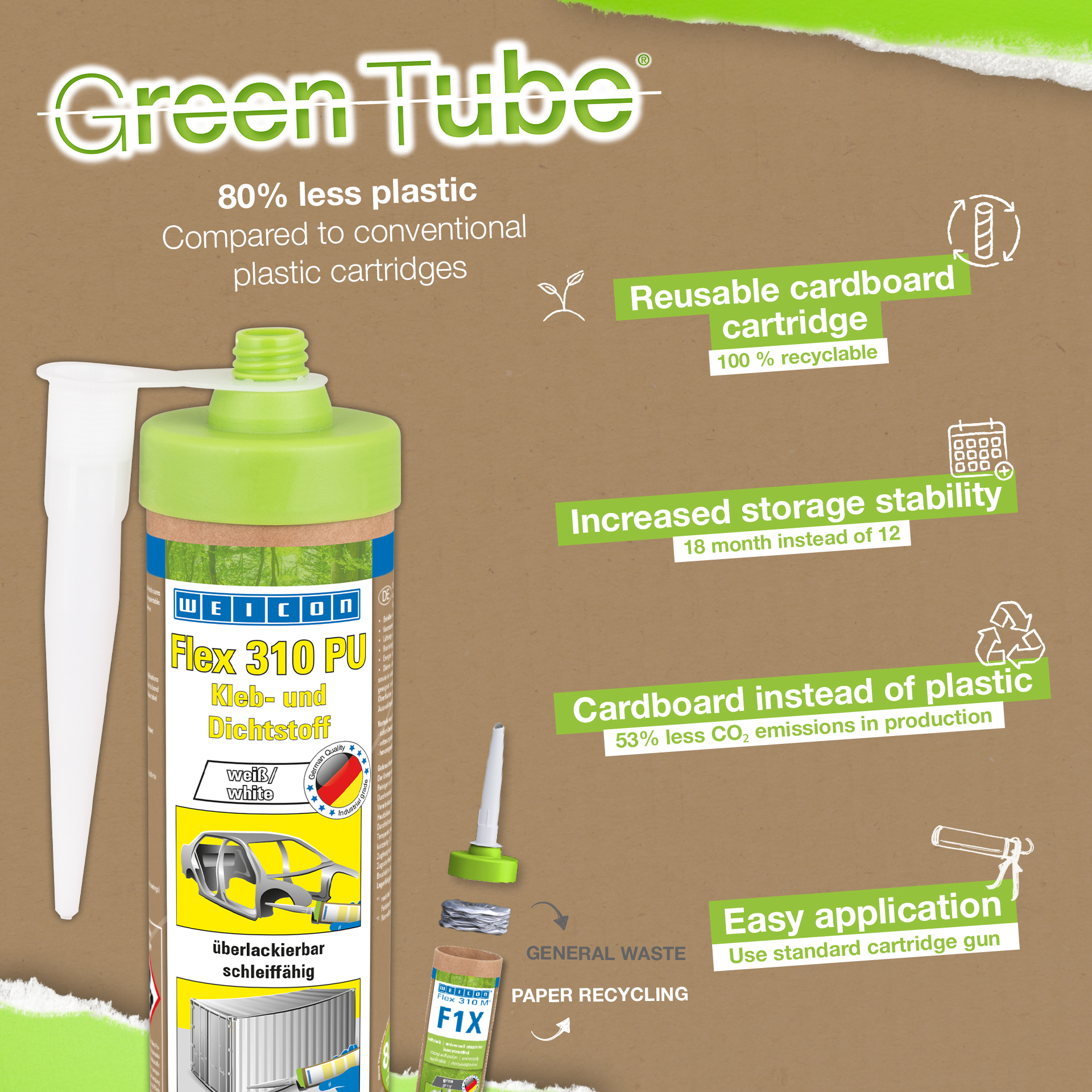 Flex 310 PU je trvalo elastický, má silnú priľnavosť, možno ho natierať, je odolný proti poveternostným vplyvom, sladkej a slanej vode a neobsahuje silikón. Tento výrobok je elastické lepidlo a tmel na báze polyuretánu (PUR) na lepenie a tmelenie mnohých materiálov, ako sú kovy, plasty, keramika, drevo, sklo a kameň. Lepidlo a tmel možno použiť v kovovýrobe, pri výrobe kontajnerov a zariadení, vo výrobe karosérií, výrobe vozidiel a kontajnerov, vo ventilačnej a klimatizačnej technike, v elektrotechnickom priemysle, pri stavbe jácht a lodí a všade tam, kde nie je možné použiť silikóny alebo výrobky obsahujúce silikón.