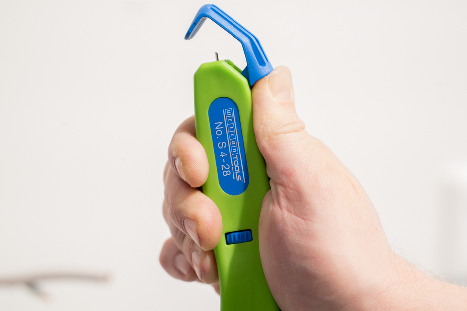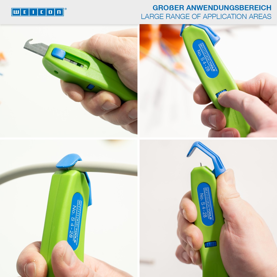 Mit der Green Line wurde eine ganz spezielle Werkzeugreihe entwickelt. Die Werkzeuge bestehen aus bis zu 97 % nachwachsenden Rohstoffen, sind recyclebar und verfügen über eine exzellente Ökobilanz. Das Kabelmesser S 4-28 ermöglicht ein präzises, schnelles und sicheres Abmanteln aller gängigen Rundkabel mit einem Durchmesser zwischen 4 und 28 Millimeter. Mit Hilfe eines Stellrades im Gehäuse kann die Schnitttiefe des Schneidmessers stufenlos reguliert werden. Dies verhindert eine Beschädigung der inneren Leiter. Das Schneidmesser ist selbstdrehend im Gehäuse integriert und ermöglicht so die automatische Umstellung von Rund- auf Längsschnitt. Zusätzlich wurde eine Hakenklinge in das S 4-28 integriert, die im Gehäuse versenkt werden kann. In beiden Positionen ist die Klinge arretierbar. Das führt zu einer deutlichen Reduktion des Verletzungsrisikos, das feststehende Klingen mit sich bringen.