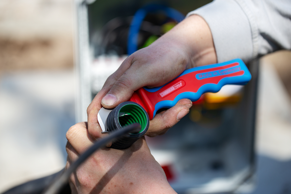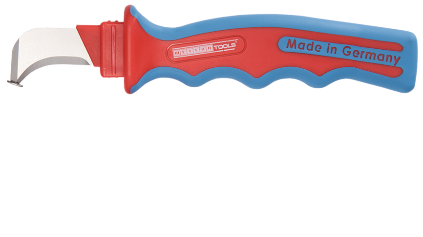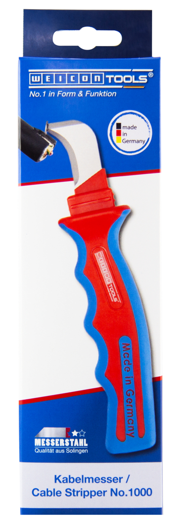 Káblový nôž HD No. 1000 je veľmi robustný a umožňuje presné, rýchle a bezpečné odizolovanie obzvlášť hrubých typov káblov. Rôzne vrstvy viacnásobne izolovaných káblov je možné použiť s HD No. 1000 ľahko narezať. Zakrivená špička čepele obmedzuje hĺbku rezu a zabraňuje tak poškodeniu vodiča. Nôž je testovaný podľa DIN EN 60900 pre prácu na kábloch pod napätím a odolá až 1.000 voltom.