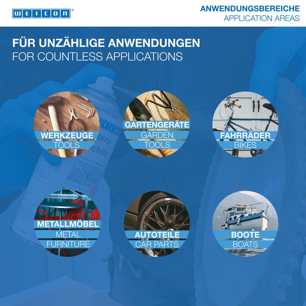 WEICON Konzervačný sprej je ochranný film testovaný TÜV a trvalo konzervuje kovové nástroje a presné diely suchou, voskovou vrstvou. WEICON Konzervačný sprej možno použiť ako spoľahlivú ochranu proti korózii holých, nenatretých kovových dielov, na vnútorné skladovanie obrobkov, ako ochranu proti korózii pri zámorskej preprave a na konzerváciu nástrojov a presných dielov. V prípade potreby je možné ochrannú film jednoducho odstrániť (napr. WEICON Čistič S).