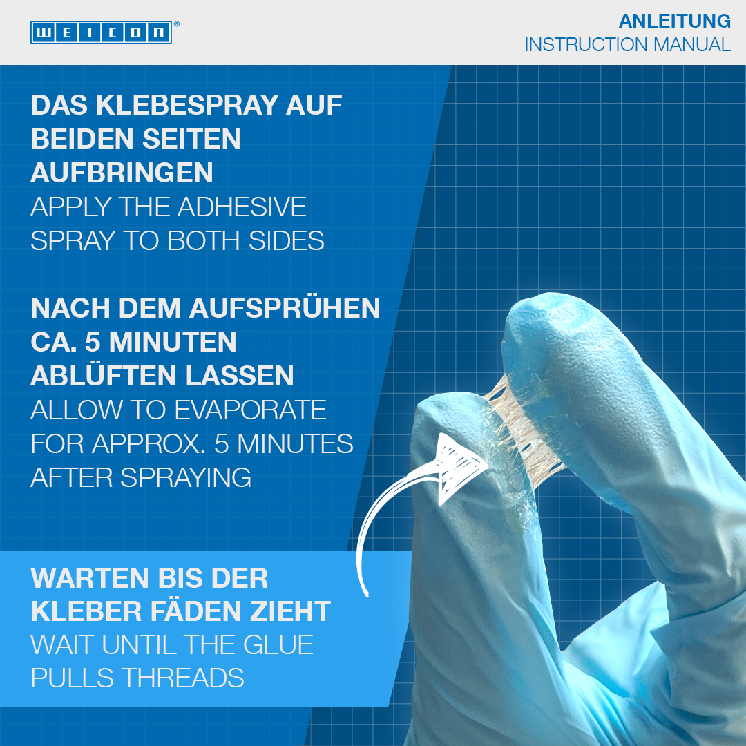 Lepidlo v spreji - extra silné je špeciálny typ pre pevné a trvalé, lepené spoje nerovných a drsných plôch. Dávkovanie možno plynule regulovať špeciálnym ventilom. WEICON Lepidlo v spreji - extra silné možno použiť na lepenie filzu, fólie PVC, umelej kože, kobercov, plastov, lepenky, penové a machové gumy, izolačných materiálov, mäkkej peny, vinylu, kože, gumy, kovov a dreva. Je vhodné tiež pre veľkoplošné spoje.