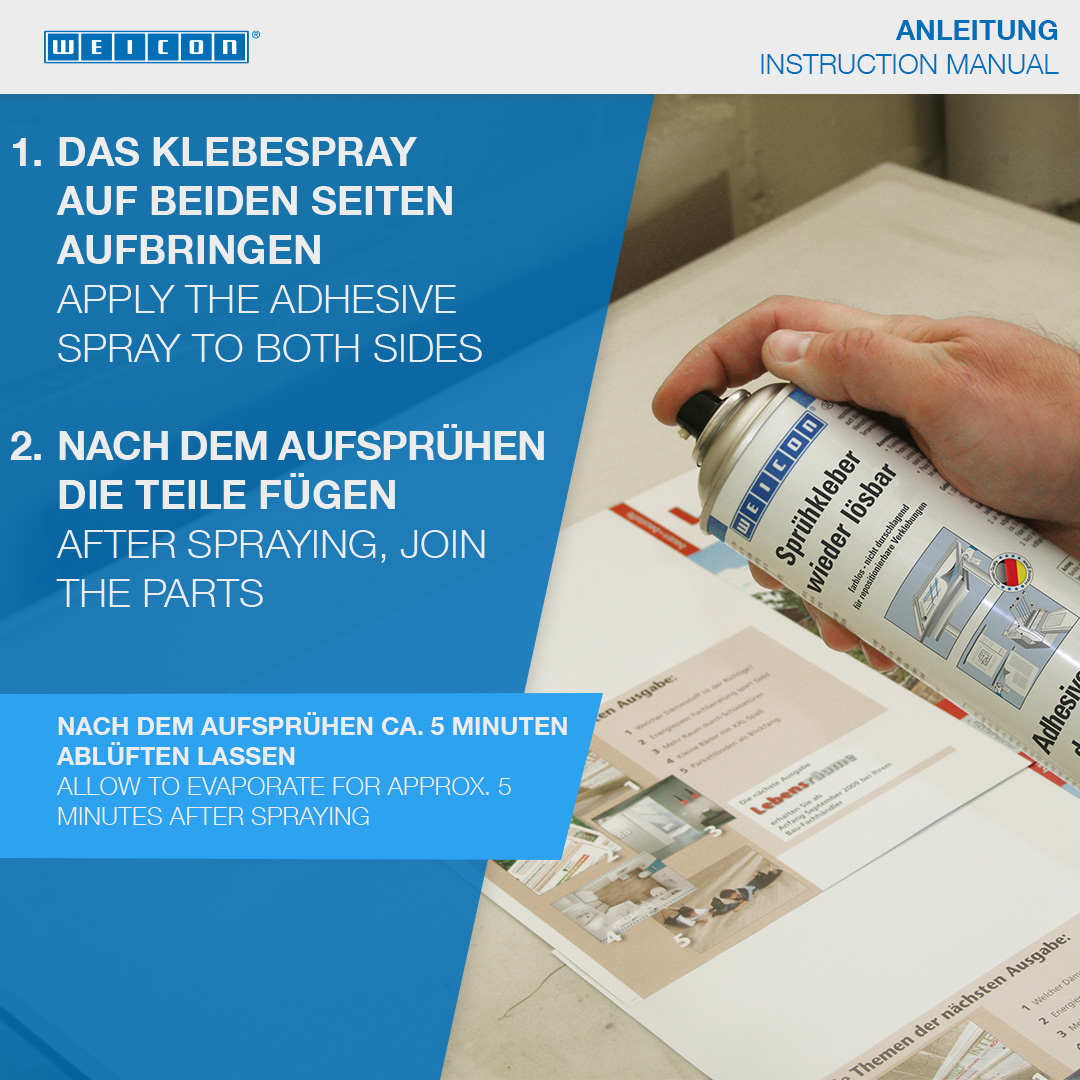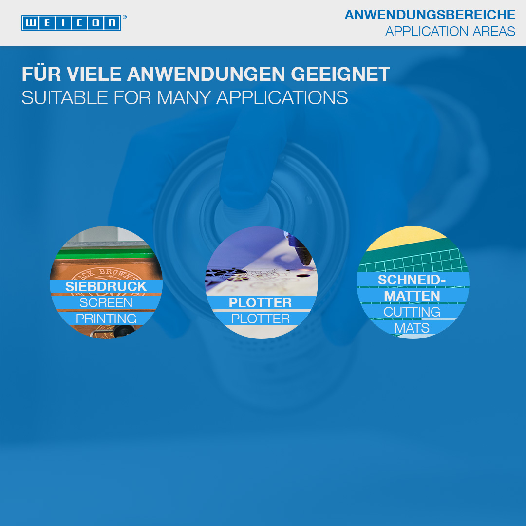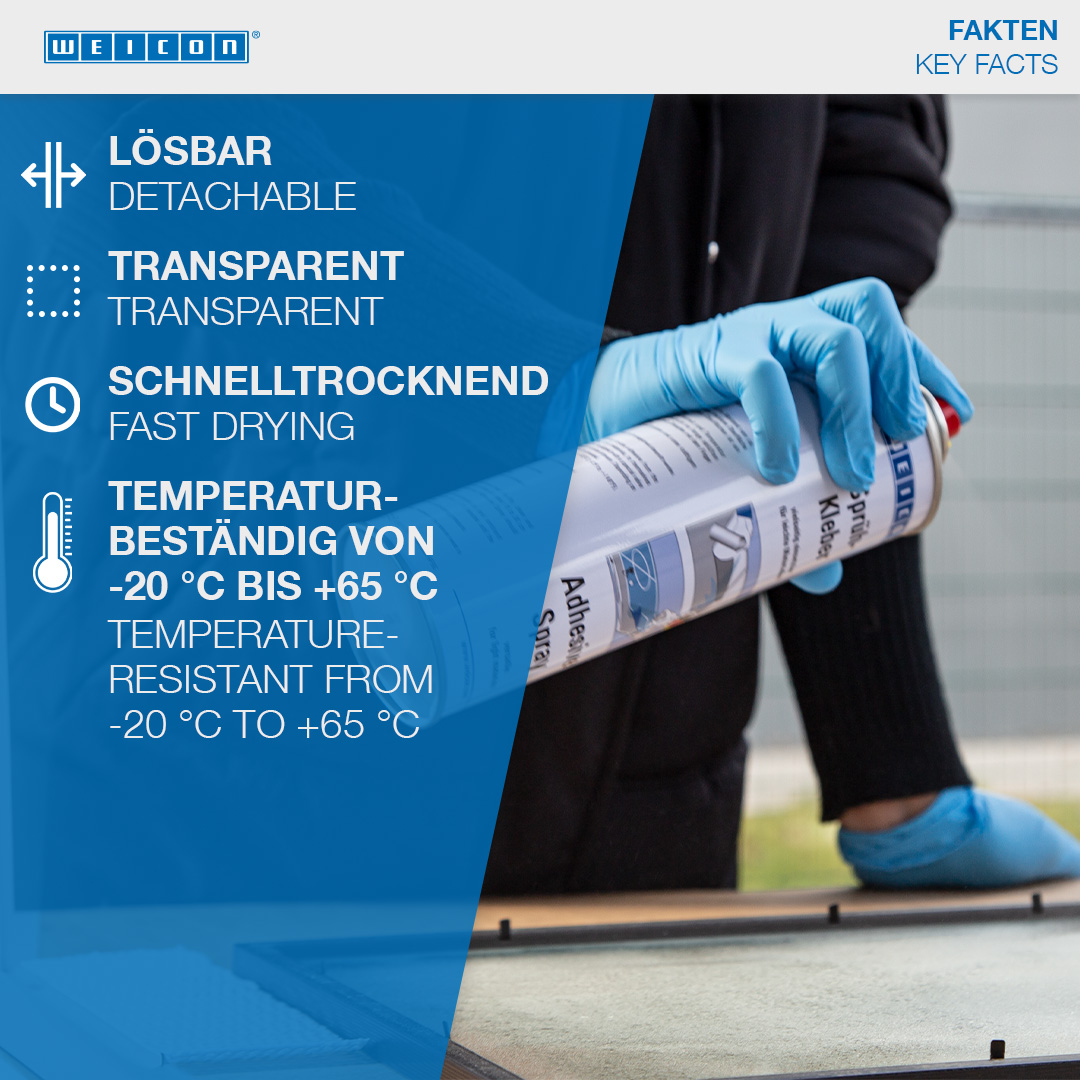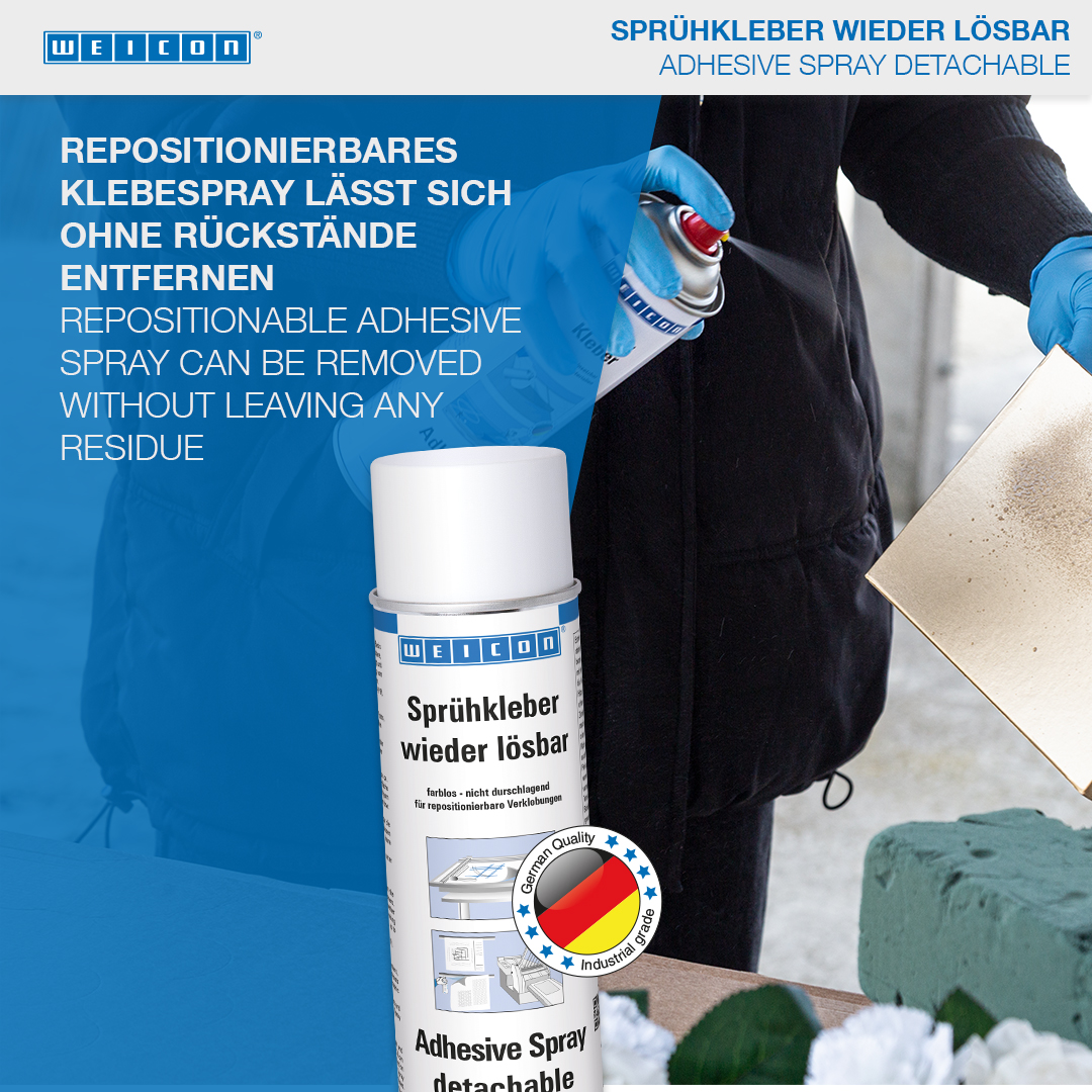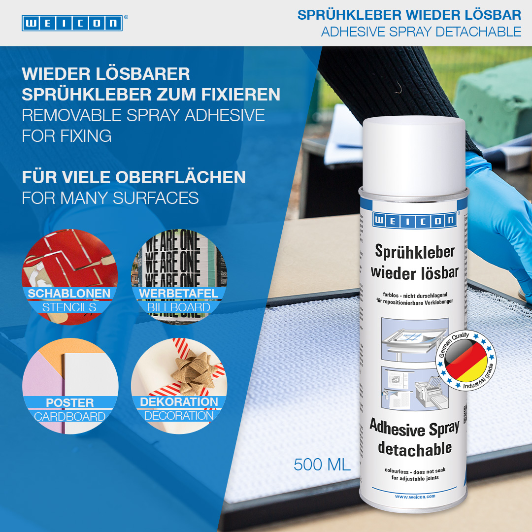 WEICON Lepidlo v spreji - odlepiteľné je určené pre rozoberateľné lepené spoje. Lepidlo v spreji - odlepiteľné je bezfarebné, nespôsobuje prefarbenie, alebo zvlnenie tenkých materiálov. Pomocou neho je možné navzájom lepiť papier, lepenku a fólie. Pri jednostrannom nanesení možno spojenie opäť uvoľniť, pri obojstrannom nánose je spojenie trvalé. WEICON Lepidlo v spreji - odlepiteľné možné používať na fixáciu napr. šablón, reklamných tabúľ, plagátov, fotografií, dekorácií napr. na výstavách, na polotovaroch, alebo na technických výkresoch.