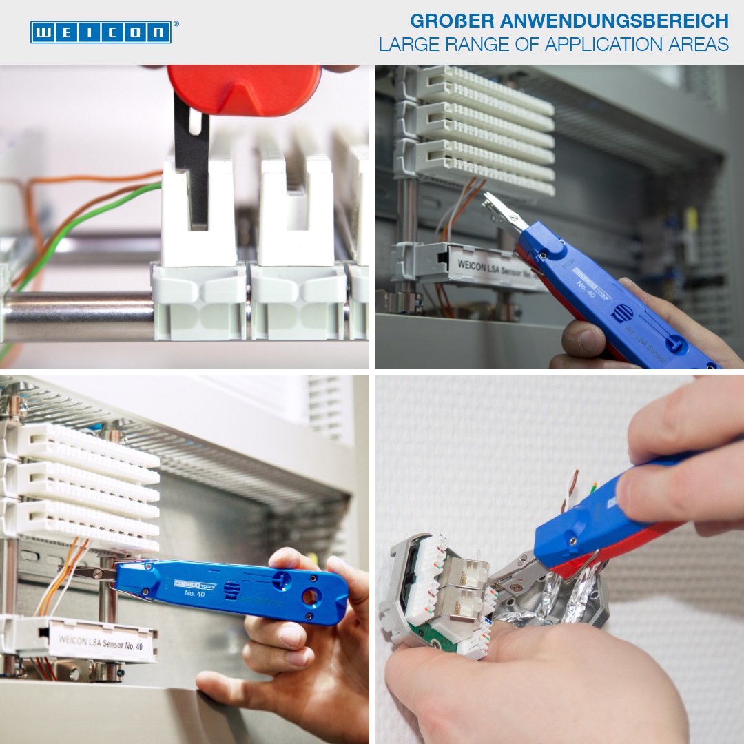 S LSA Senzor No. 40, na LSA pásy alebo bloky je možné pripojiť vodiče s priemerom kábla 0,35 - 0,9 mm a priemerom vodiča 0,7 - 2,6 mm. Miernym tlakom na nástroj sa drôty dotknú a odrežú len v jednej operácii. Ručné odizolovanie alebo skrutkovanie nie je potrebné. Integrované nožnice možno v prípade potreby vypnúť, napríklad ak si neželáte odstrihnúť zostávajúci koniec drôtu. Senzor zabezpečuje, že nožnice sa aktivujú až po zatlačení drôtu dostatočne hlboko do kontaktu. Ak sú kontakty prepojené dvakrát, senzor je možné deaktivovať (OFF). Okrem toho senzor LSA č. 40 cez výklopný vyťahovací hák na odstránenie vodičov z kontaktu LSA, ako aj výklopnú odisťovaciu čepeľ na uvoľnenie modulov LSA z montážnej konzoly. Nástroj je určený pre až 200 000 káblov (s priemerom jadra 0,4 mm).