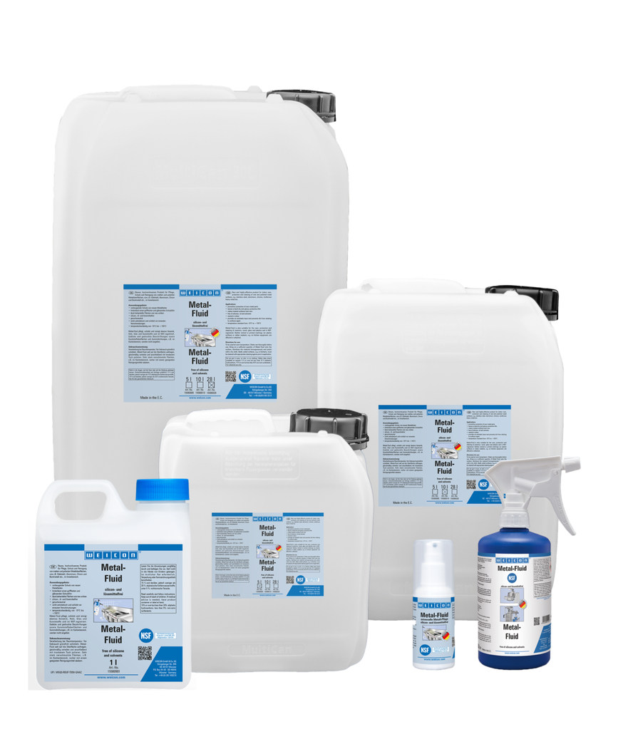 WEICON Metal-Fluid je prostriedok na čistenie a ošetrovanie matných aj leštených povrchov v interiéri, s atestom NSF. Metal-Fluid ošetruje, chráni a čistí kovy, plasty, keramiku, drevo a sklo. Neuvoľňuje leptané a vytlačené potlače, nenapadá plastové povrchy ani gumené tesnenie.