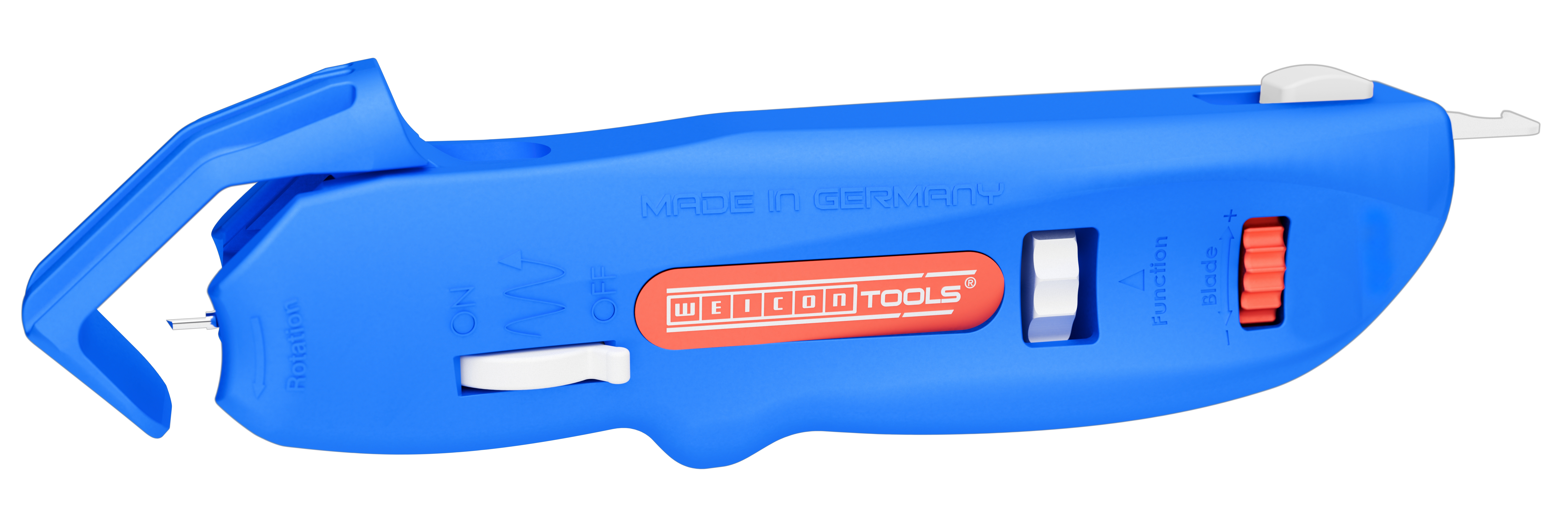 The tool is equipped with a small retractable hook blade that is operated via a slider. The self-retracting safety blade automatically retracts in the event of misuse to prevent cutting injuries. This makes the use of the blade much safer compared to fixed blades, such as those in cutter knives.