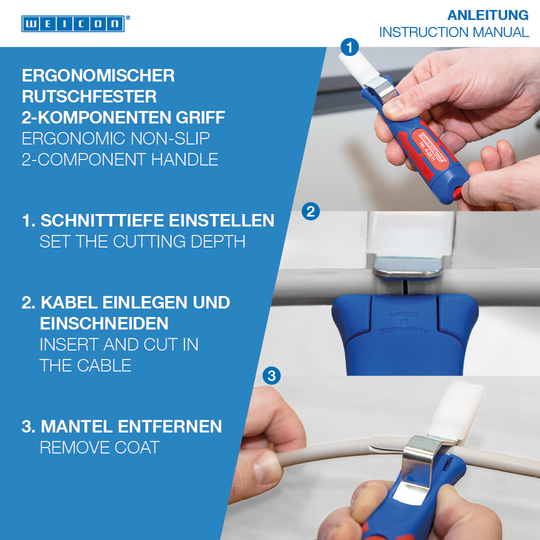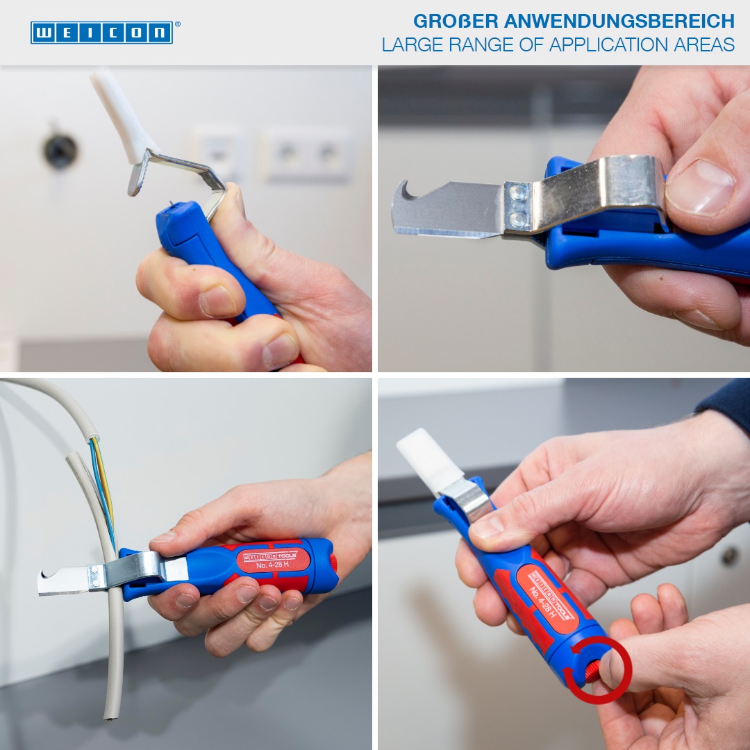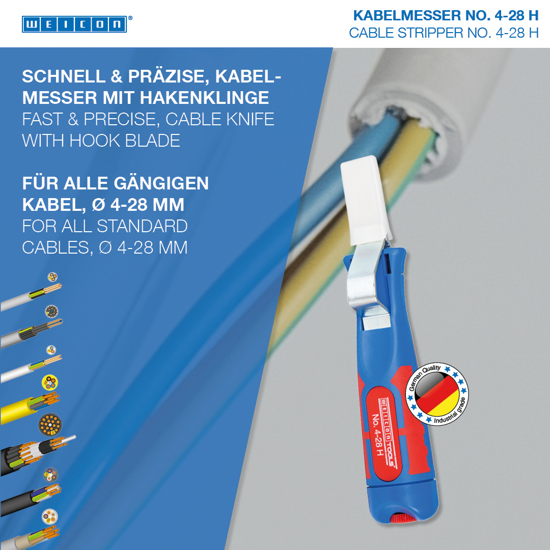 Káblový nôž No. 4-28 H umožňuje presné, rýchle a bezpečné odizolovanie všetkých bežných okrúhlych káblov s priemerom od 4 do 28 milimetrov. Káblový nôž má ergonomicky tvarovanú, protišmykovú viaczložkovú rukoväť. Pomocou nastavovacej skrutky na konci rukoväte možno plynule regulovať hĺbku rezu čepele. Tým sa zabráni poškodeniu vnútorných vodičov. Rezací nôž je samootočný a integrovaný do krytu, čo umožňuje automatické prepínanie z kruhového na pozdĺžne rezanie. Okrem toho má No. 4-28 H hákovú čepeľ, ktorá môže byť vybavená ochranným uzáverom. Táto čiapočka sa bezpečne prichytí na čepeľ, čím sa výrazne zníži riziko zranenia.