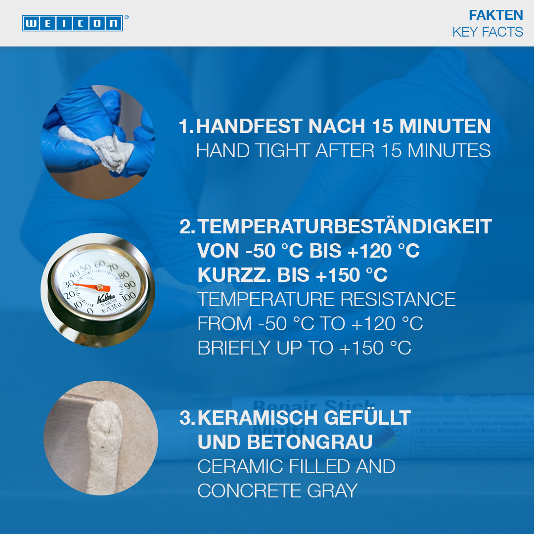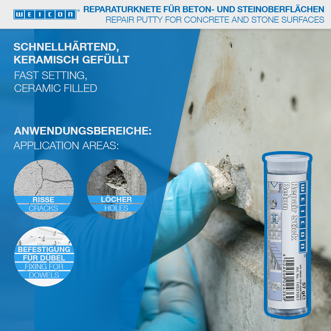 Špeciálne na rýchle opravy a retušovanie všetkých betónových, kamenných a keramických povrchov. Vypĺňa a utesňuje praskliny a chybné miesta na murive, kamenných, betónových a keramických doskách, tehlách, obrubníkoch, sochách, náhrobných kameňoch a ornamentoch a môže sa použiť na dodatočné upevnenie hmoždiniek, skrutiek a kotiev v interiéri aj exteriéri. WEICON Opravnú tyčinku Betón je možné použiť v strojárstve pri výrobe strojov a zariadení, prístrojov a v mnohých ďalších priemyselných odvetviach.