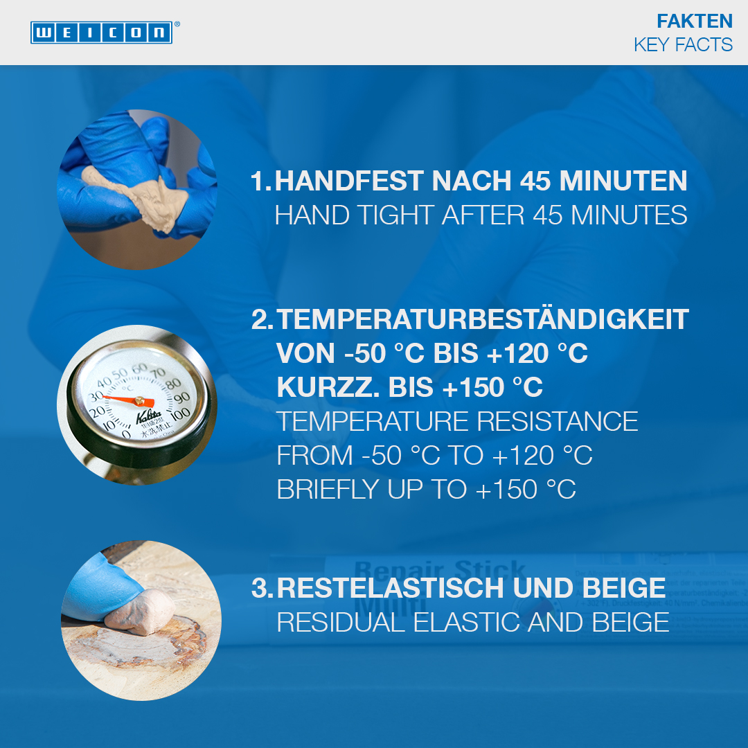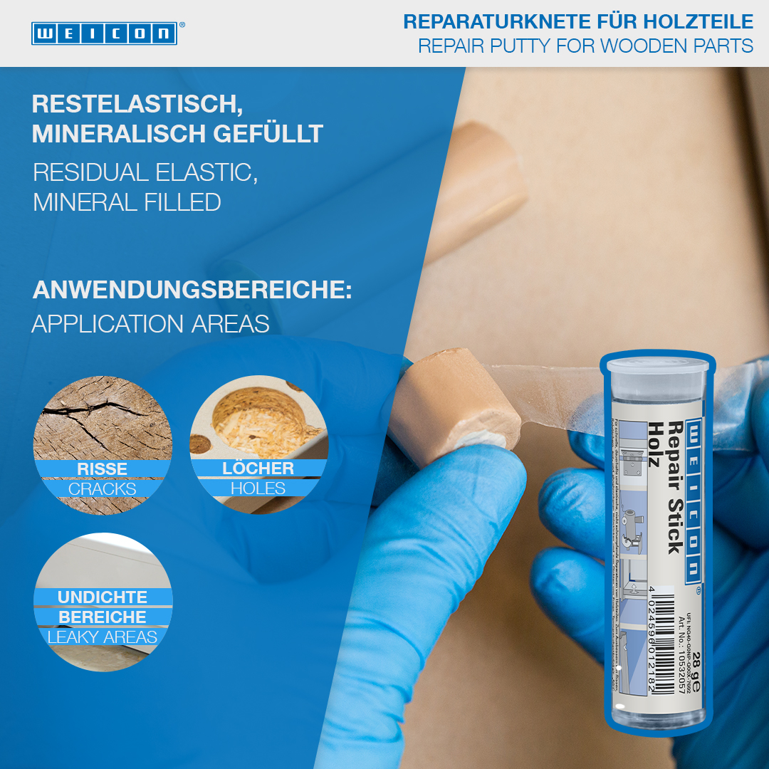 Na trvalé a stále elastické, nezmršťujúce sa opravy drevených častí. Na opravu trhlín, vyvŕtaných dier, zlomených a odlomených kusov dreva a na utesnenie škár na rámoch okien a dverí, dýh, doskách a forštách, modeloch budov a drevených hračkách. WEICON Opravnú tyčinku Drevo možno použiť v drevárskom a nábytkárskom priemysle, pri výrobe modelov a v mnohých ďalších oblastiach.