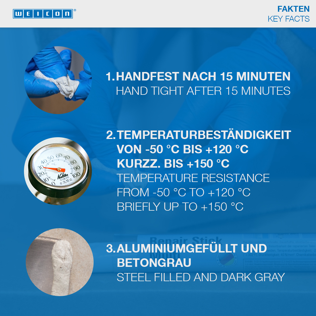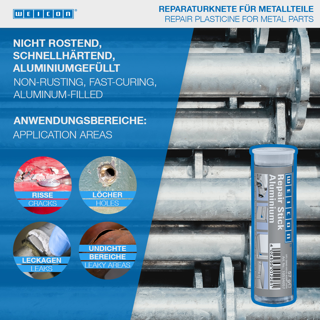 Na rýchle a nehrdzavejúce opravy a lepenie kovových dielov. Na opravu trhlín, dier, netesností a netesností na karosériách áut, prevodovkách a kontajneroch, okenných rámoch a profiloch, lodiach a modeloch. WEICON Opravnú tyčinku Hliník možno použiť pri výrobe strojov a zariadení, v automobilovom priemysle, pri výrobe ozubených kolies, pri výrobe modelov a v mnohých ďalších oblastiach.