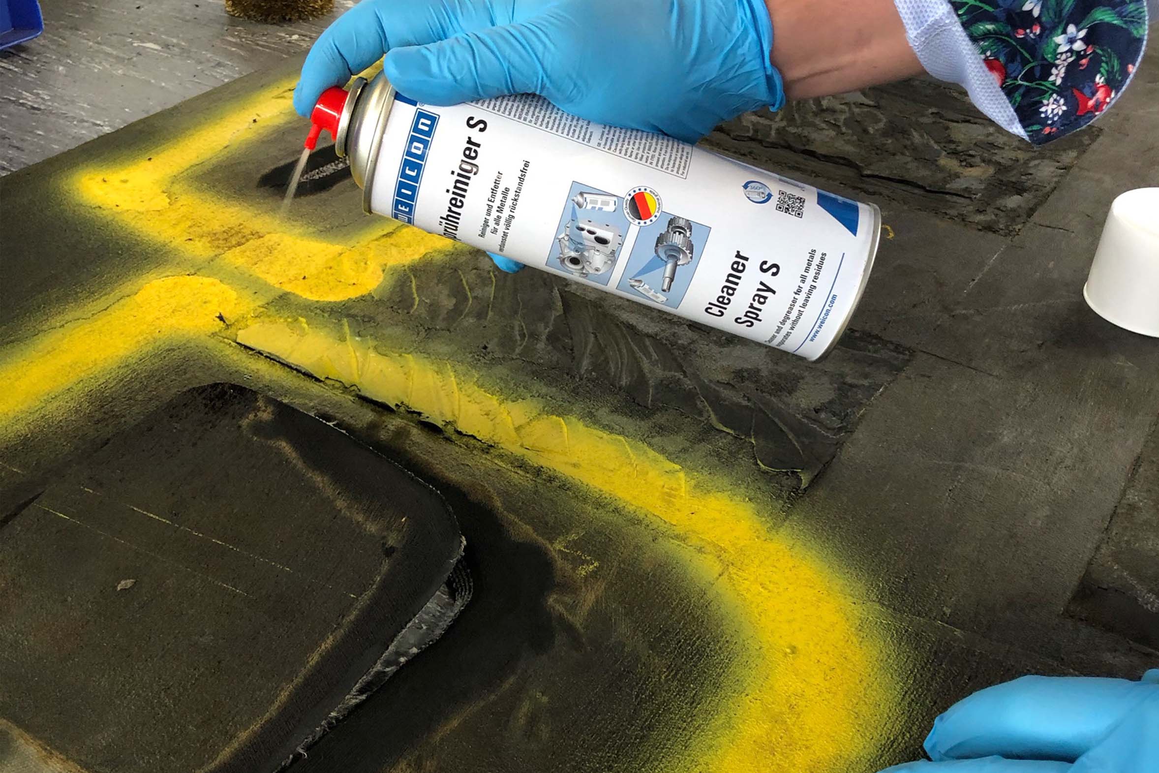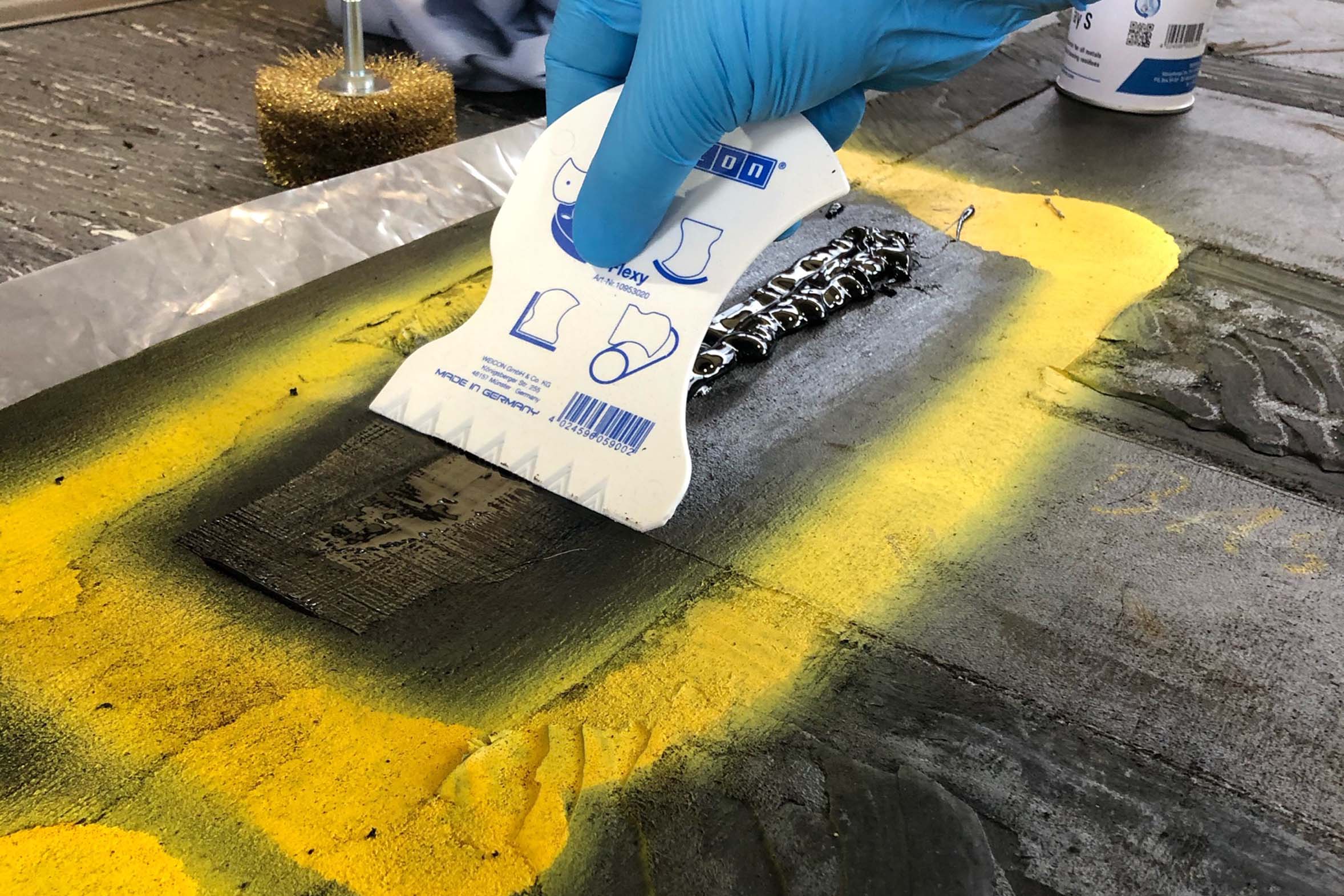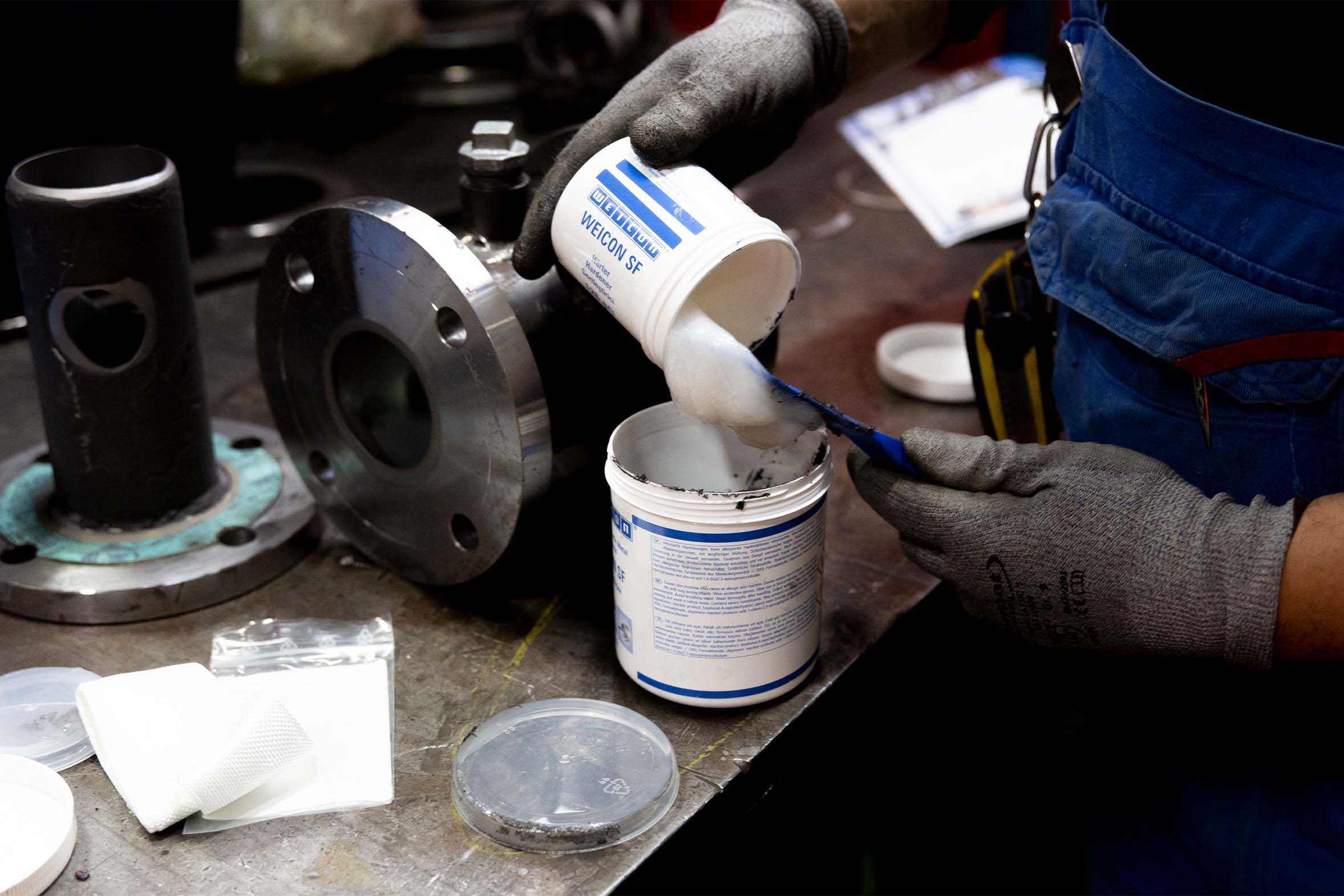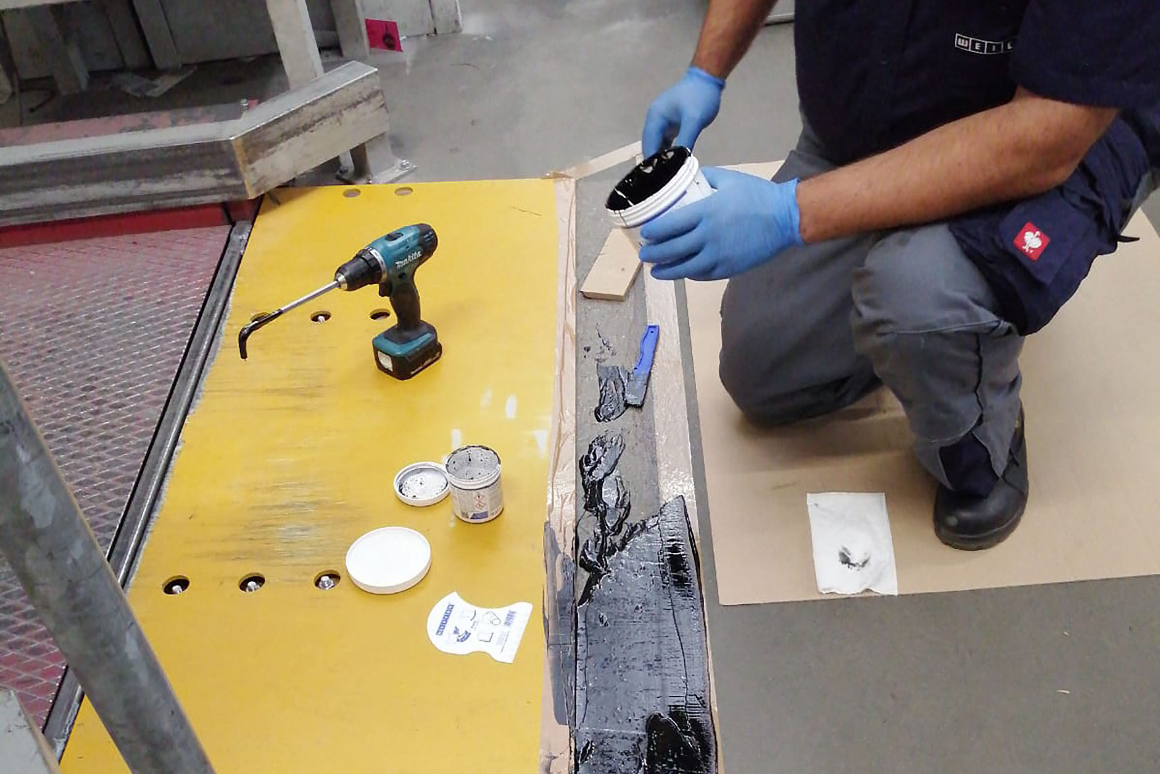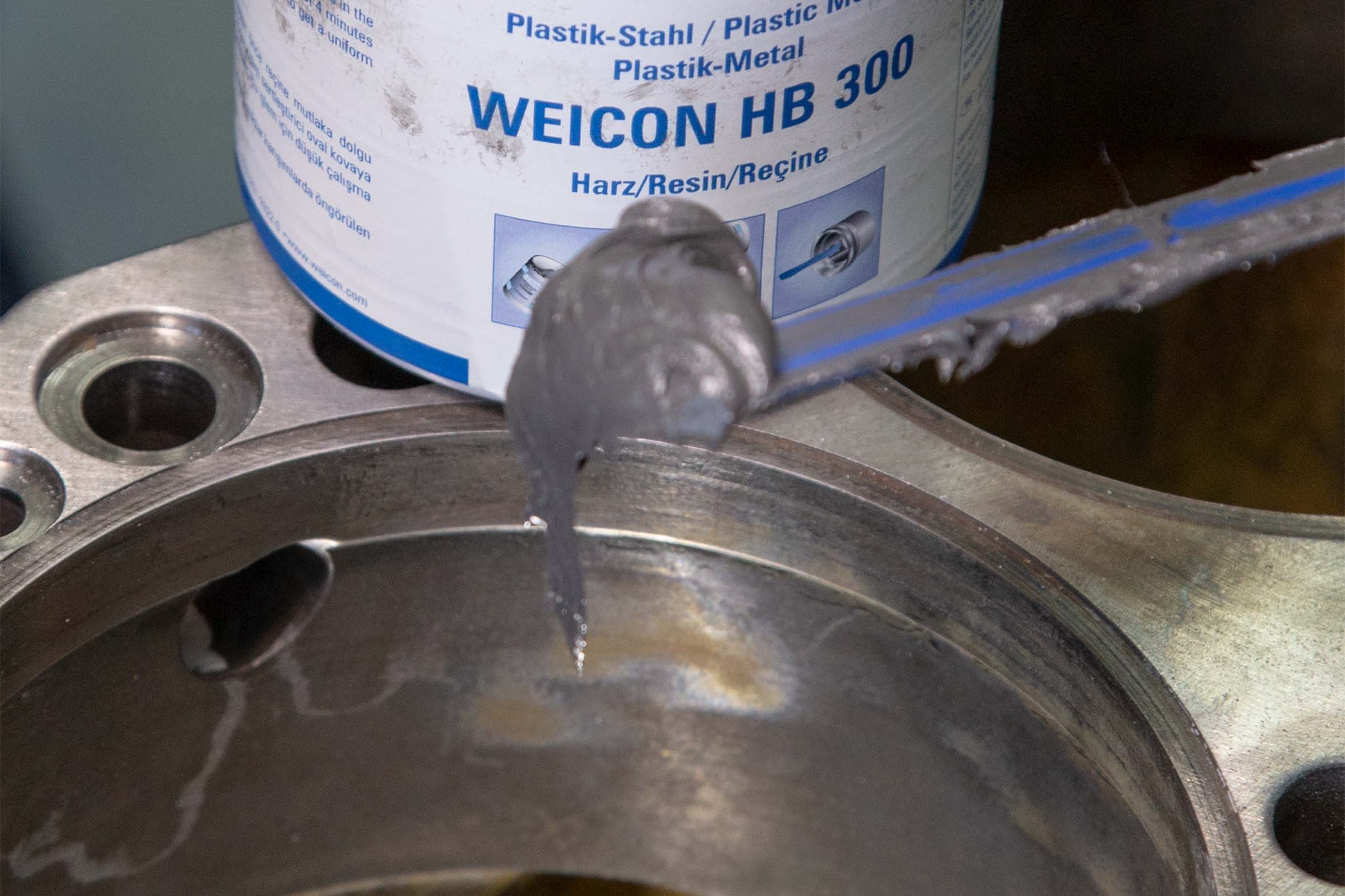 Pri oprave sa poškodené plochy krídla najprv stabilizujú pomocou WEICON Opravná tyčinka Multi. Tento univerzálny opravný tmel spoľahlivo priľne ku kovu, ľahko sa používa a rýchlo tvrdne. Následne sa vykoná rekonštrukcia po vrstvách pomocou WEICON Odlievacej živice MS 1000, vysokopevnostného epoxidového-živicového systému špeciálne vyvinutého na lepenie, laminovanie a zalievanie. Konečná povrchová úprava s WEICON Keramik HC 220 zabezpečuje maximálnu ochranu proti opotrebovaniu. Vďaka keramickej výplni a vysokej teplotnej odolnosti dlhodobo chráni vrtuľu pred odieraním a chemickými vplyvmi.