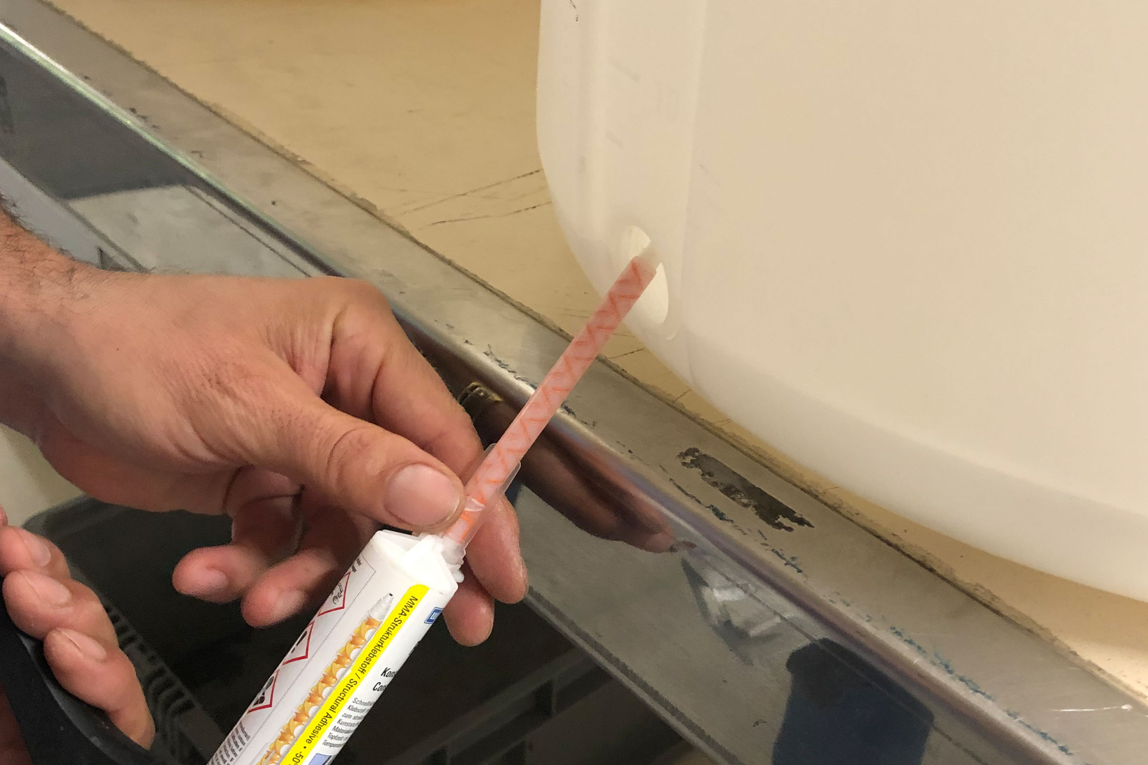V poľnohospodárstve musia byť polyetylénové nádoby na krmivo často vybavené kohútikmi a nátrubkami, aby sa umožnilo ich účinné vyprázdňovanie. Použitím WEICON Easy-Mix PE-PP 50 možno dosiahnuť spoľahlivé utesnenie a upevnenie spojov. Po vyvŕtaní otvorov a vyrezaní závitov sa povrch kohútika a rukáva dôkladne očistí WEICON Čističom povrchov. Potom sa nanesie lepidlo a komponenty sa pevne priskrutkujú.