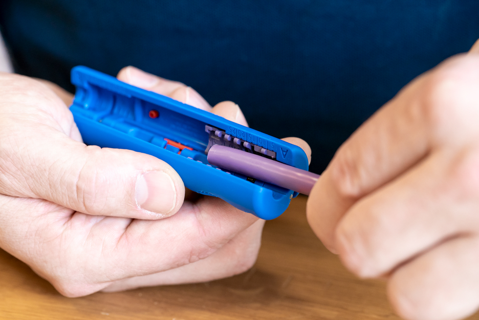 Mit dem Werkzeug Profibus Stripper No. 2 lassen sich die äußere Ummantelung und der unterliegende Schirm sauber einschneiden, um die Profibus-Leitung gemäß ihres Steckerverbinders passend abzuisolieren. Mit der Skala als optische Längenskalierung im Modul kann die entsprechende Abisolierlänge gewählt werden, um die Ethernet-Kabel passend für den FastConnect-Steckverbinder vorzubereiten. Für die Abisolierlängen von 17 mm, 20 mm, 24 mm und 30 mm sind die üblichen Maße optisch im Modul gekennzeichnet. Der Entmanteler wurde entwickelt, um Profibus-Leitungen im Bereich von 5,5 mm bis 8 mm mit zwei Klingenpaaren gleichzeitig passgenau einzuschneiden. Durch das Schnittbild wird eine ideale Vorbereitung für FastConnect-Stecker geschaffen – auch bei unterschiedlichen Kabeldurchmessern. Bei Bedarf lassen sich die Messerpaare in den Halbschalen als Module austauschen oder erneuern.