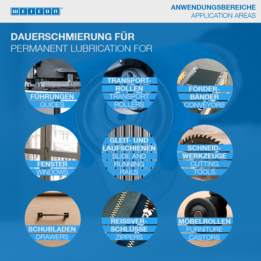 MoS2 suchý klzný sprej je suché mazivo bez tuku s vysokou odolnosťou proti tlaku a vysokým teplotám od -200°C do +450°C. Povlak odpudzuje nečistoty, prach a vodu, je odolný proti olejom, tukom a chemikáliám, priľne na kovoch, plastoch a na dreve. Vysoký podiel MoS2 zaisťuje čisté mazanie, znižuje trenie, slúži ako núdzové mazanie a potláča hlučnosť. WEICON MoS2 suchý klzný sprej skracuje a skvalitňuje zábeh klzných ložísk, ozubených a ďalších prevodov, najmä pri vysokom zaťažení tlakom a pri nízkych klzných rýchlostiach. WEICON MoS2 suchý klzný sprej možno použiť pre vodiace koľajnice a klzné vedenia, pre pásové alebo valčekové dopravníky, sklzy, pre prevádzku raziacich zariadení, nakladacie mechanizmy, ako náhrada za silikónové separátory a všade tam, kde je mazanie tukom alebo olejom nežiaduce alebo neprípustné.