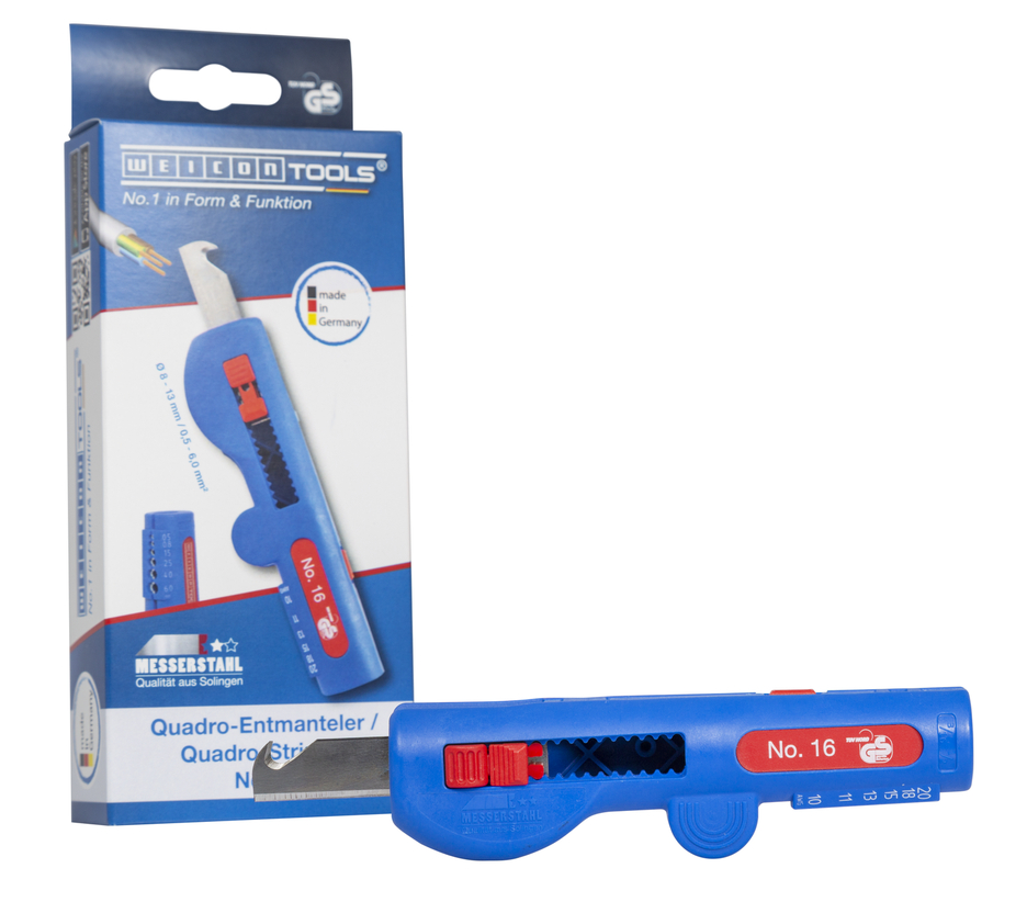 Quadro-Sttripper No. 16 je novovyvinutý nástroj pre profesionálnych používateľov v priemysle a obchode. Nástroj 4 v 1 plní niekoľko funkcií: kruhový rez - pozdĺžny rez - odizolovanie - rezanie. To znamená, že niekoľko nástrojov možno nahradiť jedným. To šetrí peniaze a miesto v skrinke s nástrojmi. Optimálne integrované vedenie káblov v puzdre zaisťuje bezpečné, presné a pohodlné odizolovanie všetkých bežných okrúhlych káblov a káblov do vlhka, káblov s priemerom 8,0 - 13,0 mm. (napr. kábel NYM 3 x 1,5 mm² až 5 x 2,5 mm). Ergonomický tvar rukoväte uľahčuje používanie nástroja. Výrazná rukoväť znamená, že Quadro-Stripper No. 16 dobre a bezpečne padne do ruky a nešmýka sa. To uľahčuje každodennú prácu a zvyšuje aj bezpečnosť. Dokonca aj na ťažko prístupných miestach alebo v rozvodných a rozbočovacích skriniach možno káble odblankovať a odizolovať v jednej rovine s nástrojom. Hĺbka rezu sa nemusí regulovať ručne. Všetky bežné ohybné a pevné vodiče s prierezom 0,5 - 6 mm² je možné spracovať v integrovanom odizolovacom priestore. Univerzálny nástroj má zasúvaciu čepeľ háku, ktorá sa dá zaaretovať v akejkoľvek polohe a ľahko sa vymieňa.