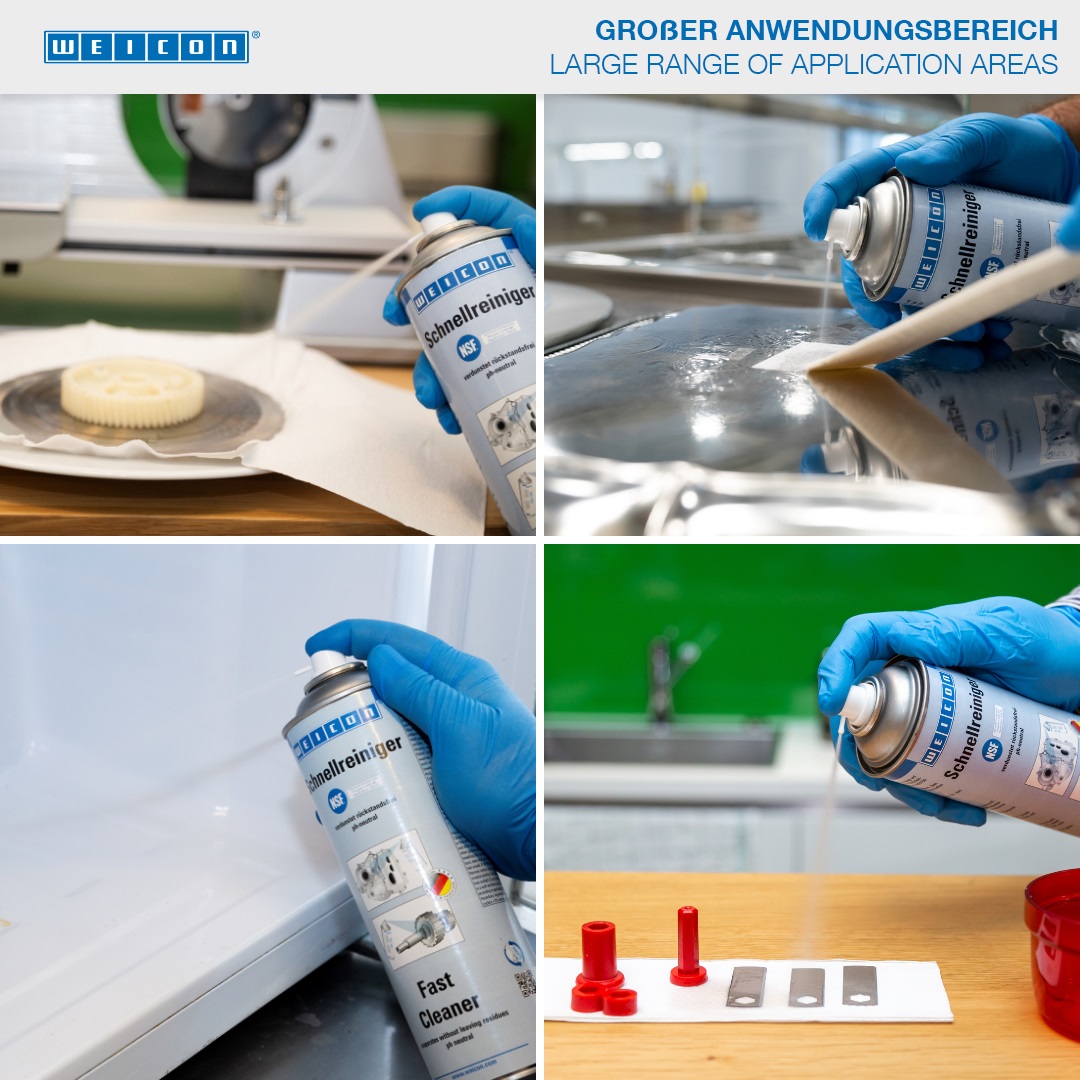 WEICON Rýchlo-čistič je registrovaný v NSF na použitie v potravinárskom priemysle a preto sa môže používať ako čistič a odmasťovač na odstraňovanie nečistôt počas opravárenských prác a na odstraňovanie lepidiel v potravinárskom, nápojovom, farmaceutickom a kozmetickom priemysle. Rýchlo-čistič sa používa na čistenie a odmasťovanie povrchov, ktoré sa majú lepiť, alebo utesňovať lepidlami a tmelmi WEICON, alebo lakovať s WEICON sprejmi s kovom. Rýchlo-čistič je pH neutrálny a kompatibilný s mnohými materiálmi, ako sú kovy, sklo, keramika a väčšina gumy a plastov. Vďaka svojmu špeciálnemu zloženiu a výslednej registrácii NSF môže Rýchlo-čistič prispieť k zlepšeniu bezpečnosti a ochrany zdravia na pracovisku.