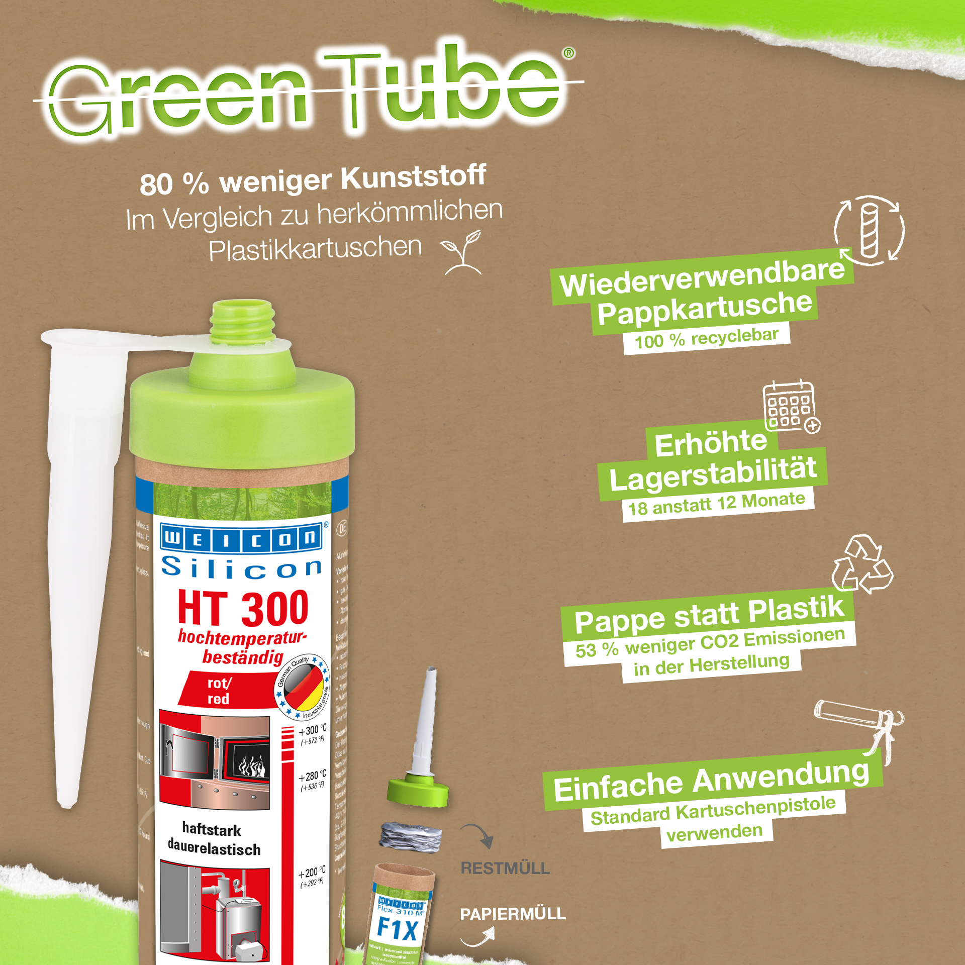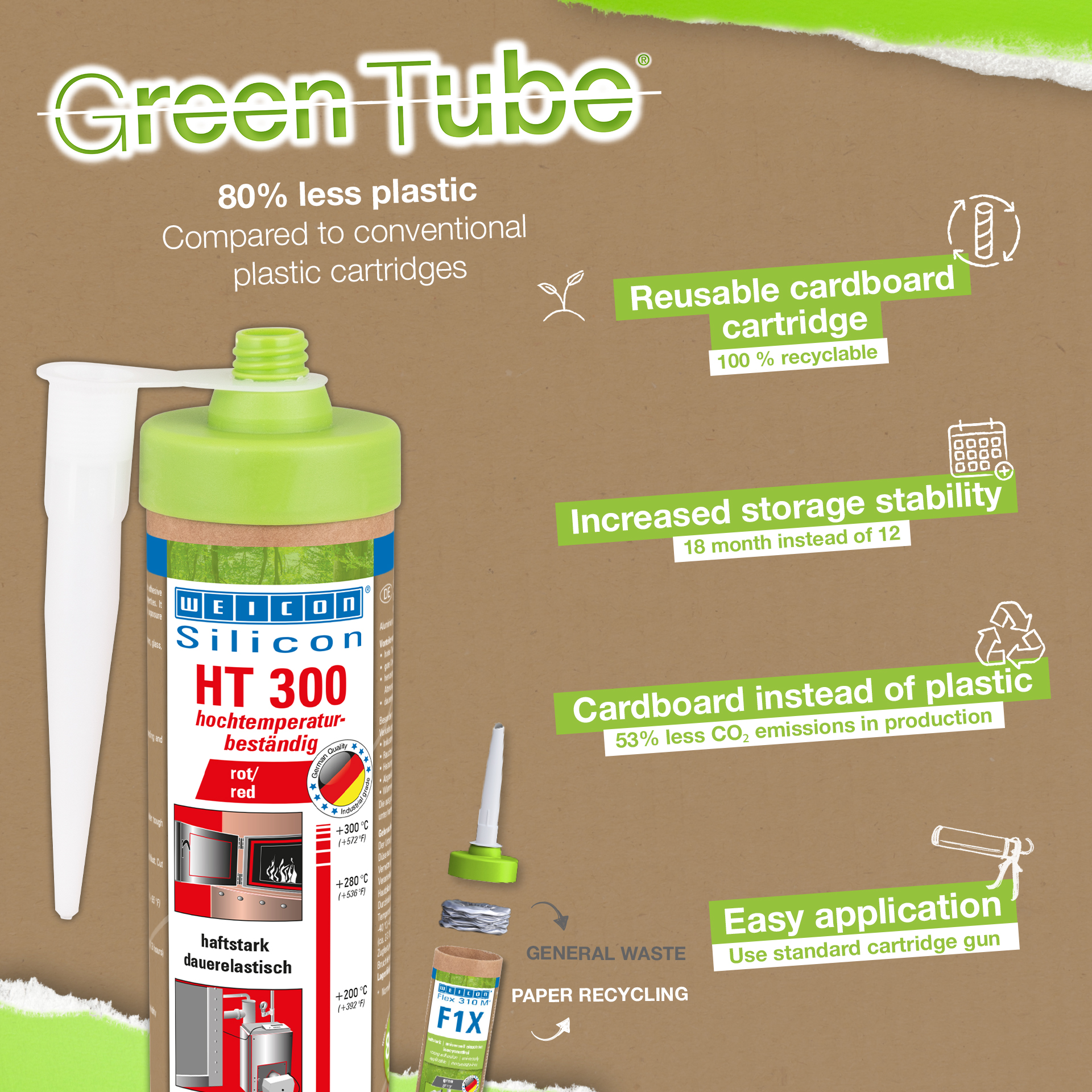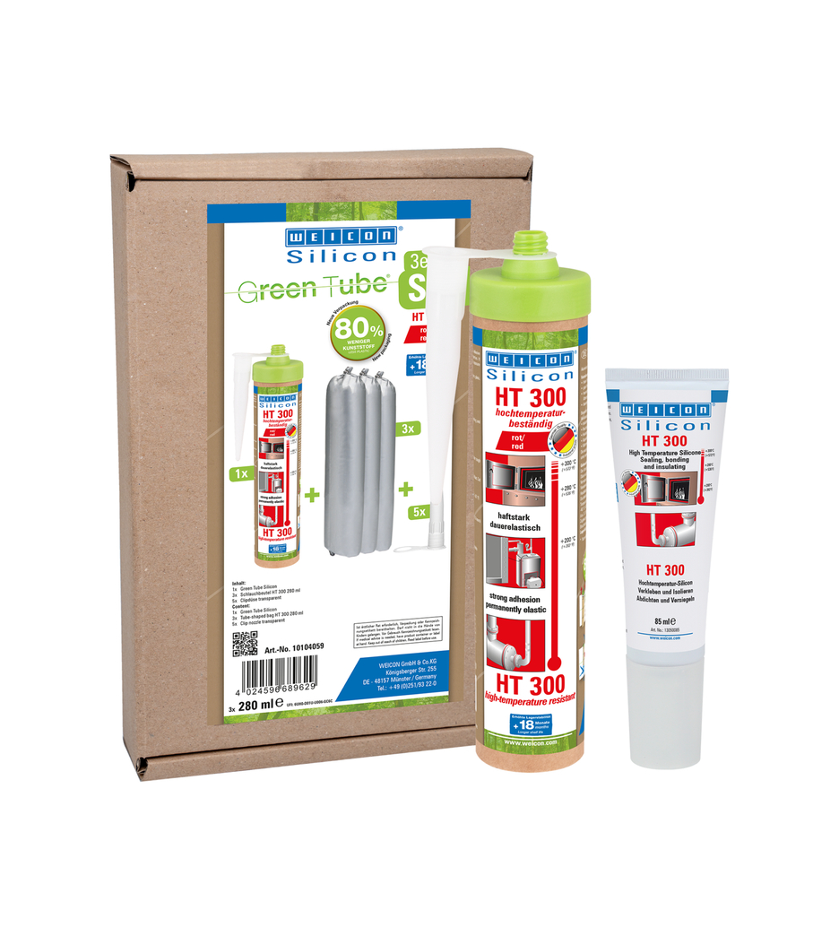 WEICON HT 300 je červený, odolný proti vysokým teplotám (+300 °C/+572 °F), bez rozpúšťadiel, vysoko priľnavý, acetátovo zosieťovaný, odolný voči poveternostným vplyvom, starnutiu a chemikáliám a extrémne pružný (predĺženie pri pretrhnutí približne 300 %). Výrobok je obzvlášť vhodný na lepenie a tesnenie pod vplyvom tepla a veľmi dobre priľne k oceli, hliníku, sklu, keramike a mnohým ďalším materiálom. Lepidlo a tesniaci tmel možno použiť v priemyselných peciach, systémoch odvodu spalín, vykurovacích systémoch, dymovodoch, vykurovacích skrinkách a v mnohých ďalších oblastiach.