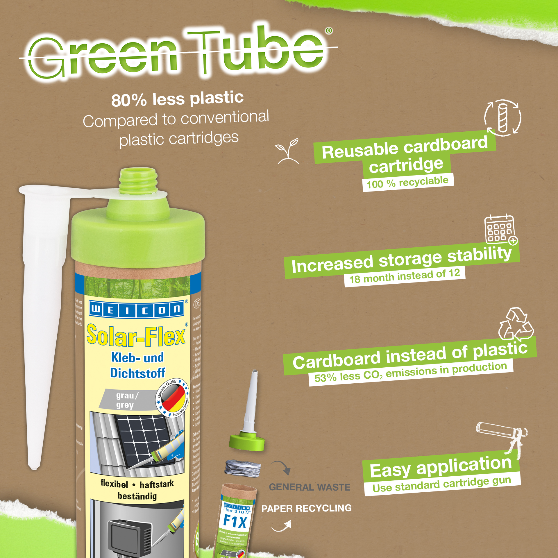 WEICON Solar-Flex je priľnavý, nekoroduje, možno ho prelakovať "mokré do mokrého", je odolný proti poveternostným vplyvom, UV-žiareniu a neobsahuje silikón, izokyanát, halogény a rozpúšťadlá. Solar-Flex je elastické lepidlo na báze MS polymérov špeciálne pre solárny priemysel. Veľmi vysoká počiatočná priľnavosť a rýchly nárast pevnosti lepidla umožňujú lepenie aj na zvislé povrchy. Nahrádza bežné spôsoby upevnenia pri montáži solárnych a fotovoltaických systémov.