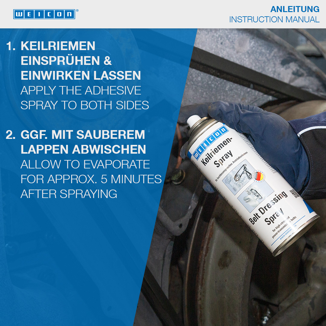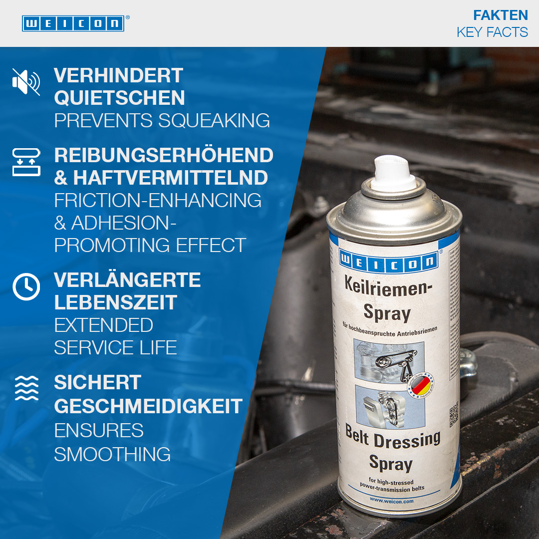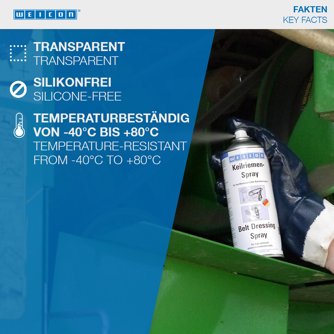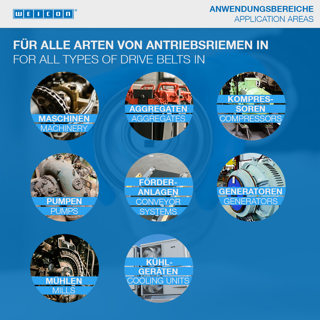 WEICON Sprej na klinové remene je transparentný prostriedok na remene na báze syntetických elastomérov pre silno namáhané hnacie remene všetkých druhov. Predlžuje životnosť strojov a zariadení, zabraňuje odlupovaniu remeňov, prenáša plný výkon, odstraňuje pískanie, preniká do hĺbky pórov, zvyšuje účinnosť prenosu síl, zvyšuje trenie a priľnavosť, zabraňuje vzniku statického výboja, zvyšuje elasticitu a chráni pred starnutím. Sprej na klinové remene pre všetky druhy remeňov a pásov z obvyklých materiálov, napríklad z tkanín, kože, gumy alebo PVC. Možno ho použiť pre remene klinové, článkové, ploché, okrúhle, ozubené, rebrované, transmisné, alebo pre dopravníkové pásy. WEICON Sprej na klinové remene je vhodný pre všetky druhy hnacích remeňov v strojoch, AREG, kompresoroch, čerpadlách, generátoroch, dopravníkoch, mlynoch, vŕtacích a chladiacich zariadeniach. Pri dodržaní bezpečnostných pokynov možno použiť aj v prevádzkových podmienkach.