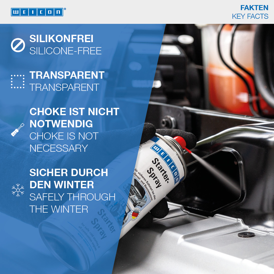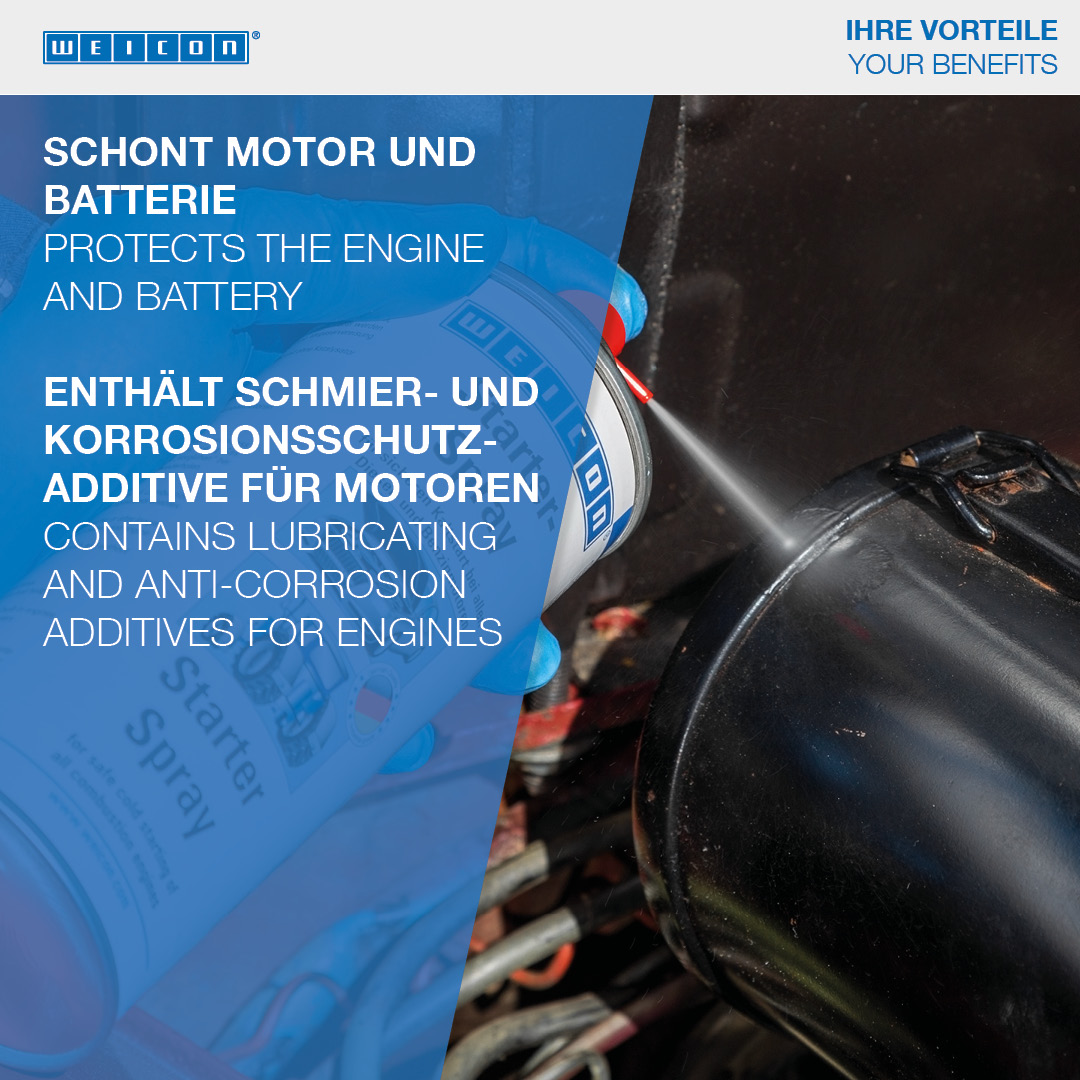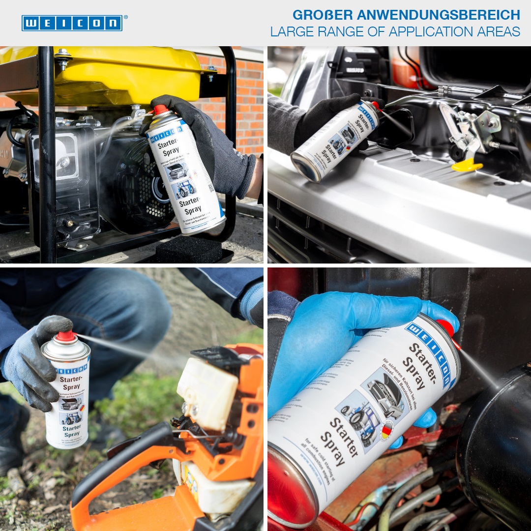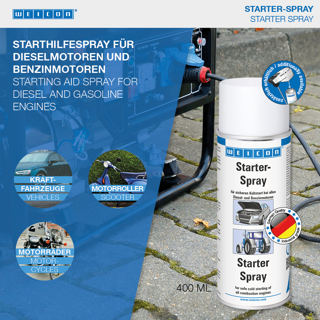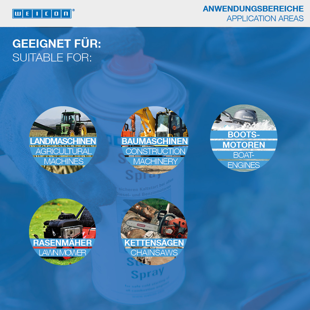 WEICON Štartovací sprej je určený na jednoduché a bezpečné spúšťanie spaľovacích motorov. Vďaka zvláštnej kombinácii účinných látok umožňuje bezpečný studený štart všetkých motorov. Použitie je vhodné najmä pri nízkych teplotách, vlhkom počasí, alebo po dlhom odstavení motora. Šetrí motor i akumulátor. Štartovací sprej je vhodný pre dieselové i benzínové motory. S katalyzátorom, alebo bez neho, nákladné vozidlá, stavebné, alebo poľnohospodárske stroje, lodné motory, motorky, skútre. WEICON Štartovací sprej možno použiť kdekoľvek.