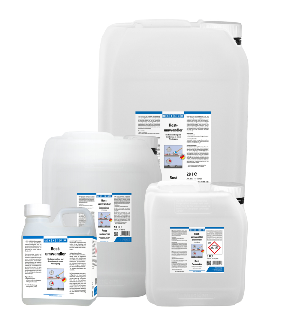 WEICON Stop hrdzi sa používa na neutralizáciu hrdze na zhrdzavených železných a oceľových povrchoch. Stop hrdzi spoľahlivo zastaví proces korózie a poskytuje tak stabilný podklad pre ďalšie povrchové nátery. Vďaka špeciálnemu zloženiu účinných látok preniká Stop hrdzi do hrdze a využíva chemický proces na premenu oxidov železa na stabilnú čiernu vrstvu. Stop hrdzi je možné použiť na všetky hrdzavé plochy, napríklad na strojoch a zariadeniach, na poľnohospodárskych zariadeniach a na motorových vozidlách.