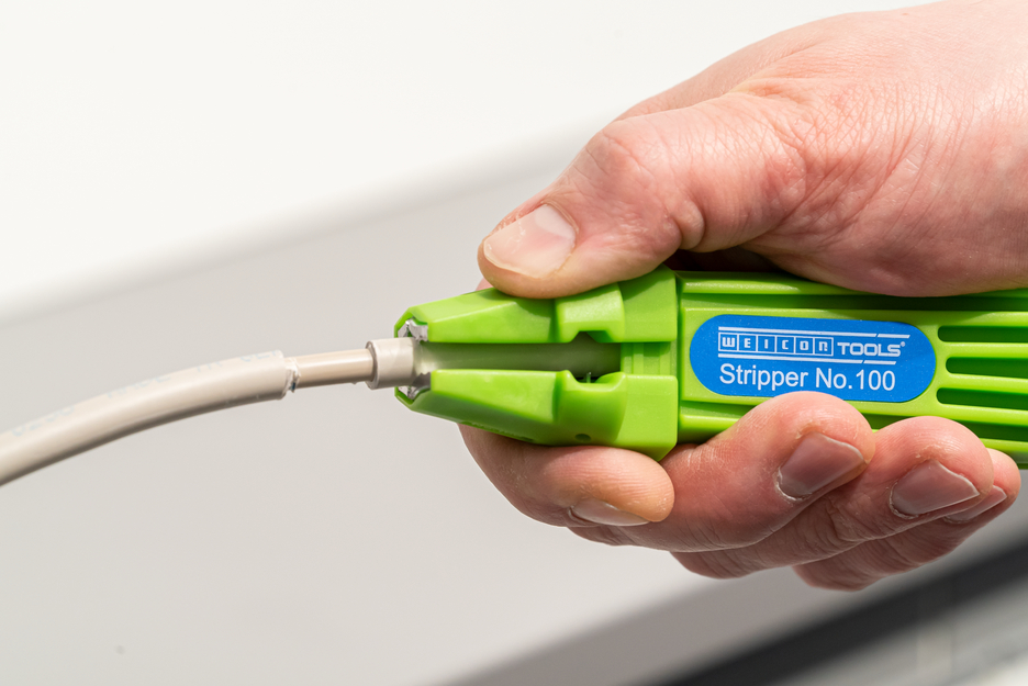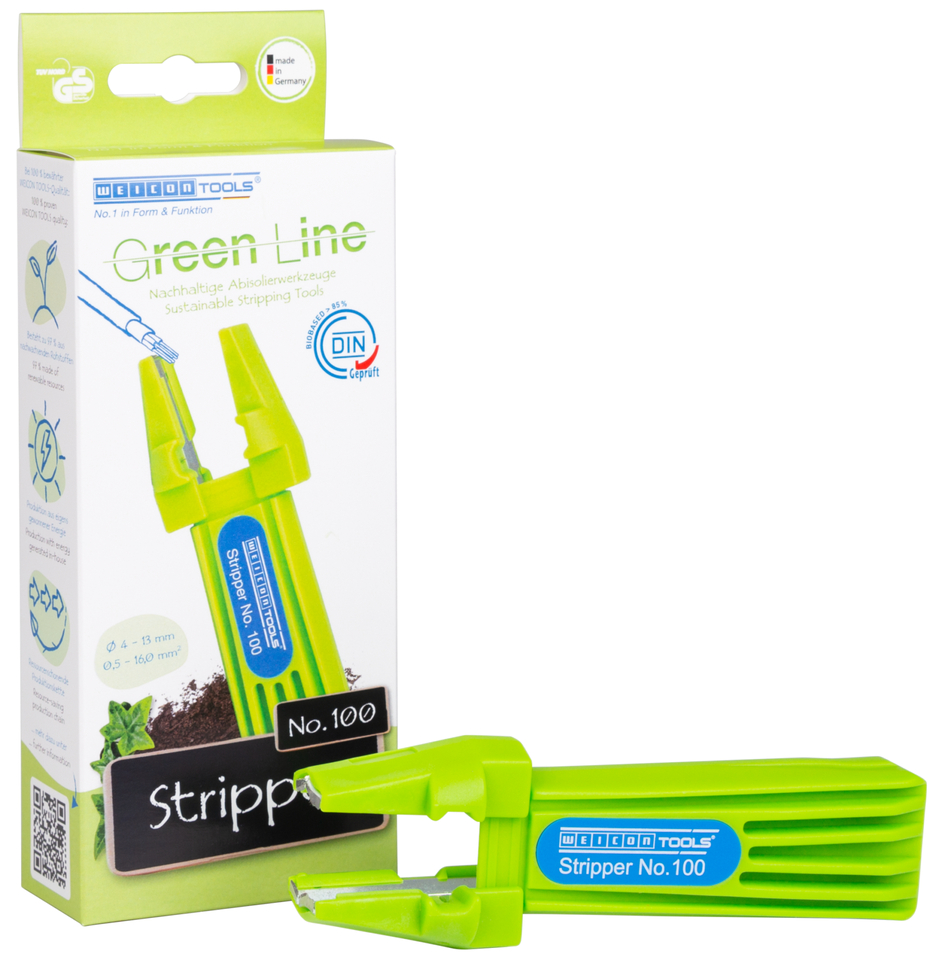 Mit der Green Line wurde eine ganz spezielle Werkzeugreihe entwickelt. Die Werkzeuge bestehen aus bis zu 97 % nachwachsenden Rohstoffen, sind recyclebar und verfügen über eine exzellente Ökobilanz. WEICON Stripper No. 100, ist ein Universal-Werkzeug zum Abmanteln und Abisolieren von unterschiedlichsten Kabelarten und -querschnitten, wie sie in der gesamten Hausinstallation Verwendung finden. Mit diesem Werkzeug kann ohne Einstellung der Schnitttiefe ein Rund- und Längsschnitt durchgeführt werden. Besonders gut geeignet für bündiges Abmanteln im Decken- und Wandbereich, z. B. in Abzweig- und Verteilerdosen. Ebenfalls gut geeignet für stufenweises Abisolieren beim Anschluß von Satellitenanlagen. Der Arbeitsbereich eignet sich bei der No.100 von 0,5 - 16 mm² / 4 - 13 mm Ø.