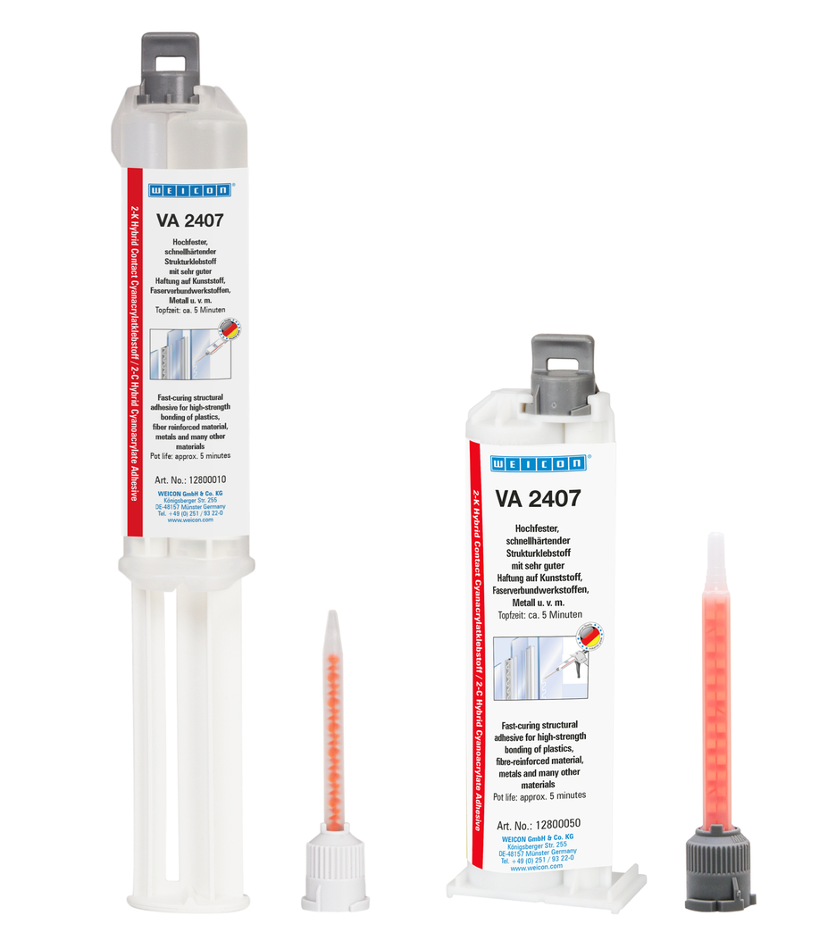 WEICON VA 2407 je bezfarebné a krištáľovo číro vytvrdzujúce, 2-zložkové kyanoakrylátové lepidlo, ktoré je určené na lepenie z najrozmanitejších materiálov medzi sebou a navzájom. Veľmi dobre priľne k mnohým plastom (napr. polykarbonát), oceli, nehrdzavejúcej oceli, hliníku, keramike, sklu a gume. Novovyvinuté lepidlo spája výhody sekundových lepidiel s procesnou spoľahlivosťou 2-zložkových lepidiel. Vysokopevnostné a rýchlo tvrdnúce konštrukčné lepidlo je možné brúsiť a prelakovať po cca. 25 minútach. Je odolný proti poveternostným vplyvom, mnohým agresívnym chemikáliám, nárazom a vibráciám. Je teplotne odolný od -20 °C do +120 °C (-4 ° až +248 °F). V závislosti od geometrie spoja je možné pomocou VA 2407 premostiť medzery až do 5 mm. Vďaka rýchlemu a nárazuvzdornému vytvrdzovaniu je obzvlášť vhodný na lepenie napr. plast a guma. Môže sa použiť aj na konštrukčné lepenie, kde by farebný lepený spoj narušil celkový vizuálny dojem z dielca. S VA 2407 je možné priehľadné plasty, ako napr. plexisklo a iné materiály, navzájom spojiť čisto a opticky príťažlivo s vysokou pevnosťou. Lepidlo je vhodné pre širokú škálu aplikácií v technológii plastov, strojárstve, výrobe modelov a foriem, kovových konštrukciách, výrobe lodí a člnov, konštrukcii karosérií a vozidiel, výstavbe veľtrhov a výstav a v mnohých ďalších oblastiach priemyslu.