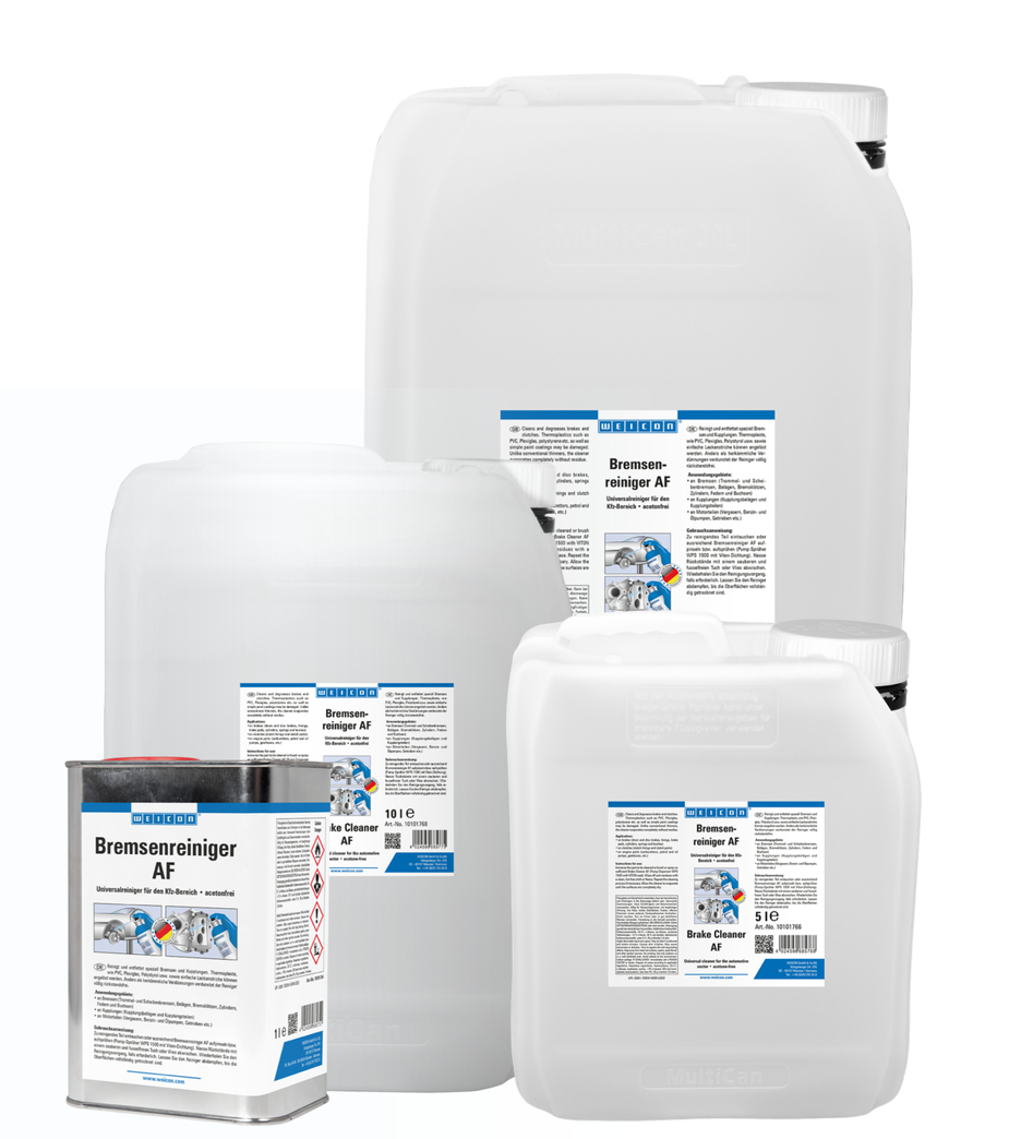 WEICON Čistič brźd AF je univerzálny čistiaci prostriedok bez acetónu pre automobilový priemysel. Tekutý prostriedok čistí, odmasťuje a odparuje sa úplne bez zvyškov. Čistič bŕzd AF rýchlo a bez námahy odmasťuje a čistí kovy, sklo, gumové materiály, práškovo lakované povrchy a mnohé plasty a spoľahlivo odstraňuje olejové a mastné nečistoty a zvyšky. Čistič možno použiť na brzdy (bubnové a kotúčové brzdy, obloženie, brzdové doštičky, valce, pružiny a puzdrá), spojky (spojkové obloženie a časti) alebo časti motora (karburátory, benzínové a olejové čerpadlá, prevodovky atď.). Je však vhodný aj na čistenie plastových profilov, tesnení alebo lakovaných povrchov a možno ho použiť v mnohých oblastiach priemyslu a obchodu.