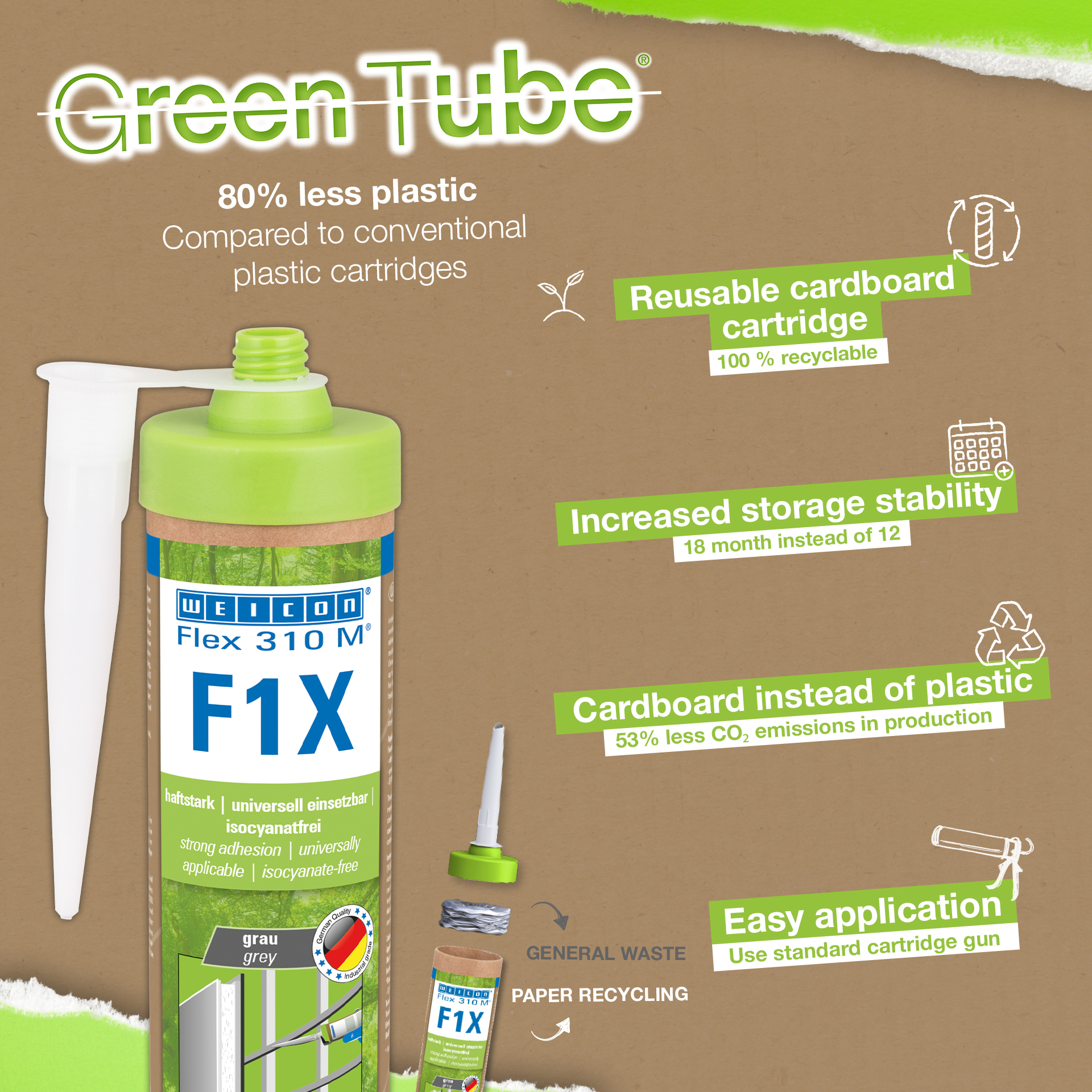 WEICON Flex 310 M F1X je elastické lepidlo a tmel na báze MS polyméru. Šedé lepidlo je veľmi silné a univerzálne vhodné na trvalé upevnenie takmer všetkých materiálov na rôzne povrchy. Vďaka veľmi vysokej počiatočnej priľnavosti je možné lepenie na zvislé povrchy a dokonca aj nad hlavou, a to v interiéri aj exteriéri. Flex 310 M F1X možno použiť napríklad na spájanie kovov, mnohých plastov, keramiky, dreva, skla a kameňa navzájom. Trvalo elastické lepidlo možno natierať "mokré na mokré", je brúsiteľné, odolné proti poveternostným vplyvom, vlhkosti, starnutiu, plesniam a UV-žiareniu. Krátkodobo (do 30 minút) je odolný proti teplotám do 180 °C a po štyroch dňoch vytvrdzovania ho možno natrieť práškovou farbou. Lepidlo a tmel neobsahuje silikón, izokyanát, halogén a rozpúšťadlá a je nekorozívne. Flex 310 M F1X možno použiť na upevnenie soklových líšt, líšt, líšt, rámov, panelov, dosiek, obkladov, kameňov a fólií EPDM. Môže sa používať v sadrokartónových a interiérových konštrukciách, v kovových konštrukciách, pri stavbe nádrží a prístrojov, pri stavbe kontajnerov, vo vetracej a klimatizačnej technike, pri stavbe veľtrhov a obchodov, pri stavbe jácht a lodí a všade tam, kde nie sú vhodné silikóny alebo výrobky obsahujúce silikón. Udržateľne balené - rovnako silné! Green Tube, udržateľné balenie: dýza a uzáver sú vyrobené zo 100 % recyklovaného plastu a telo náplne je vyrobené zo 100 % kartónu. Nižšie emisie CO₂ a nižšia spotreba plastu ako pri bežných náplniach. Bez kompromisov vo výkone!