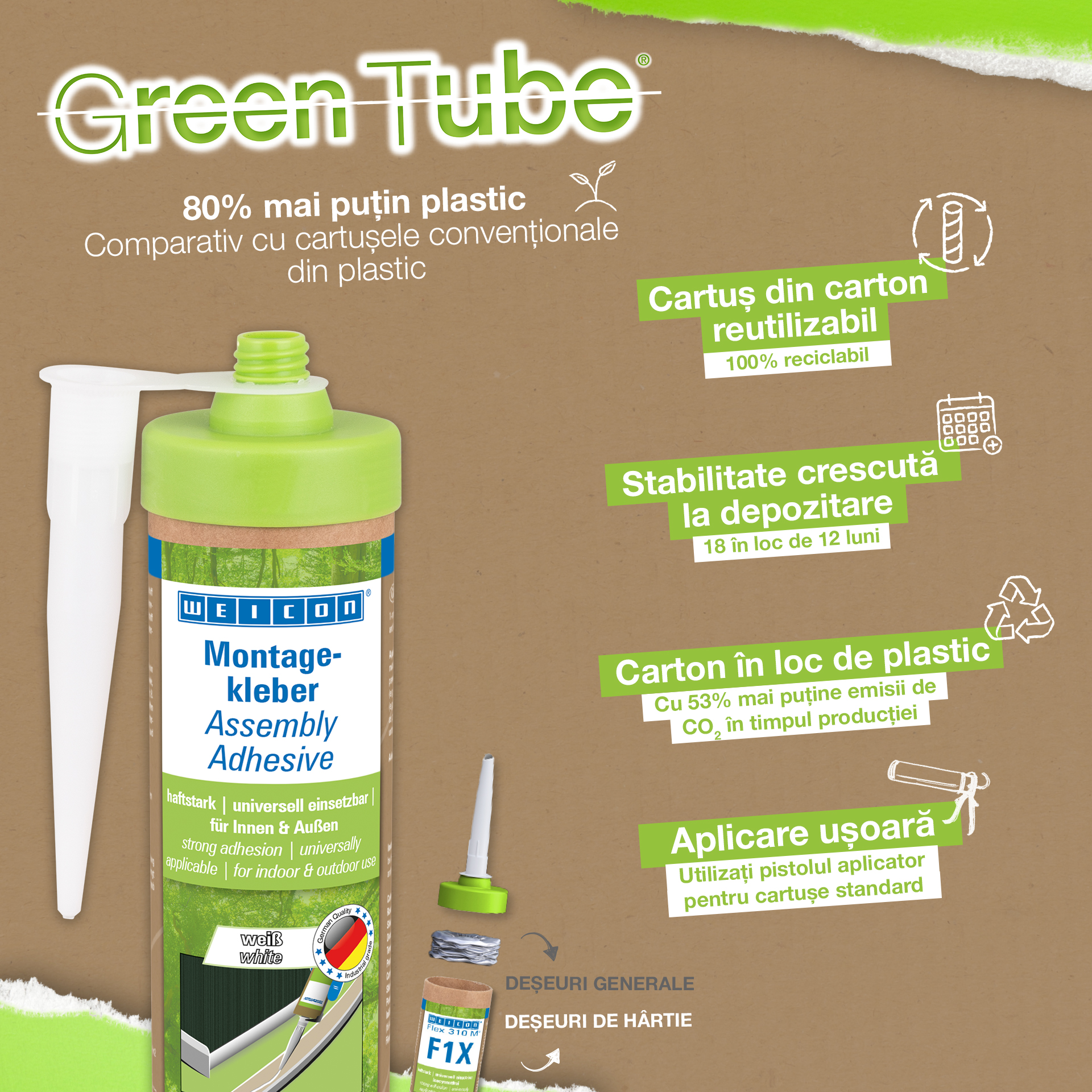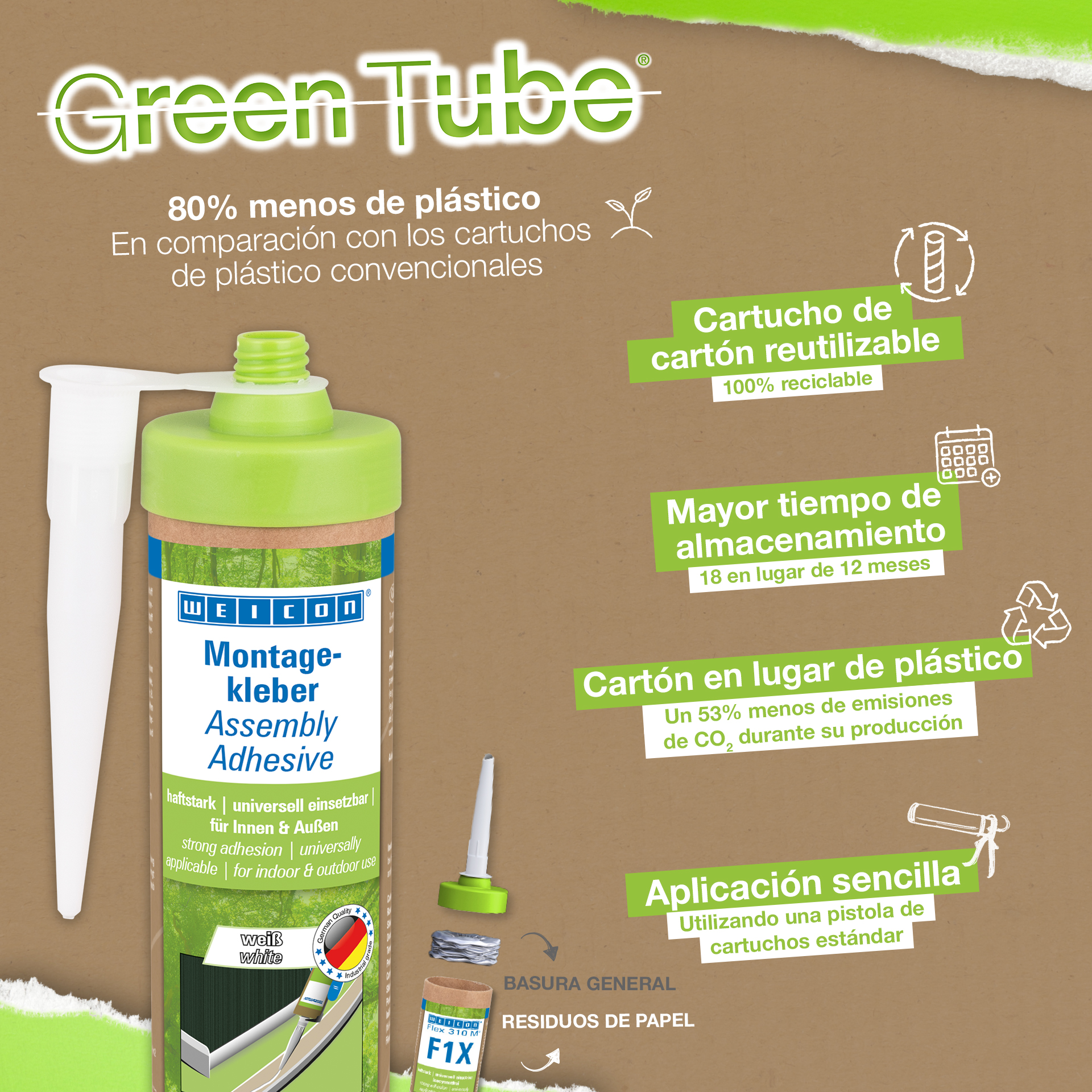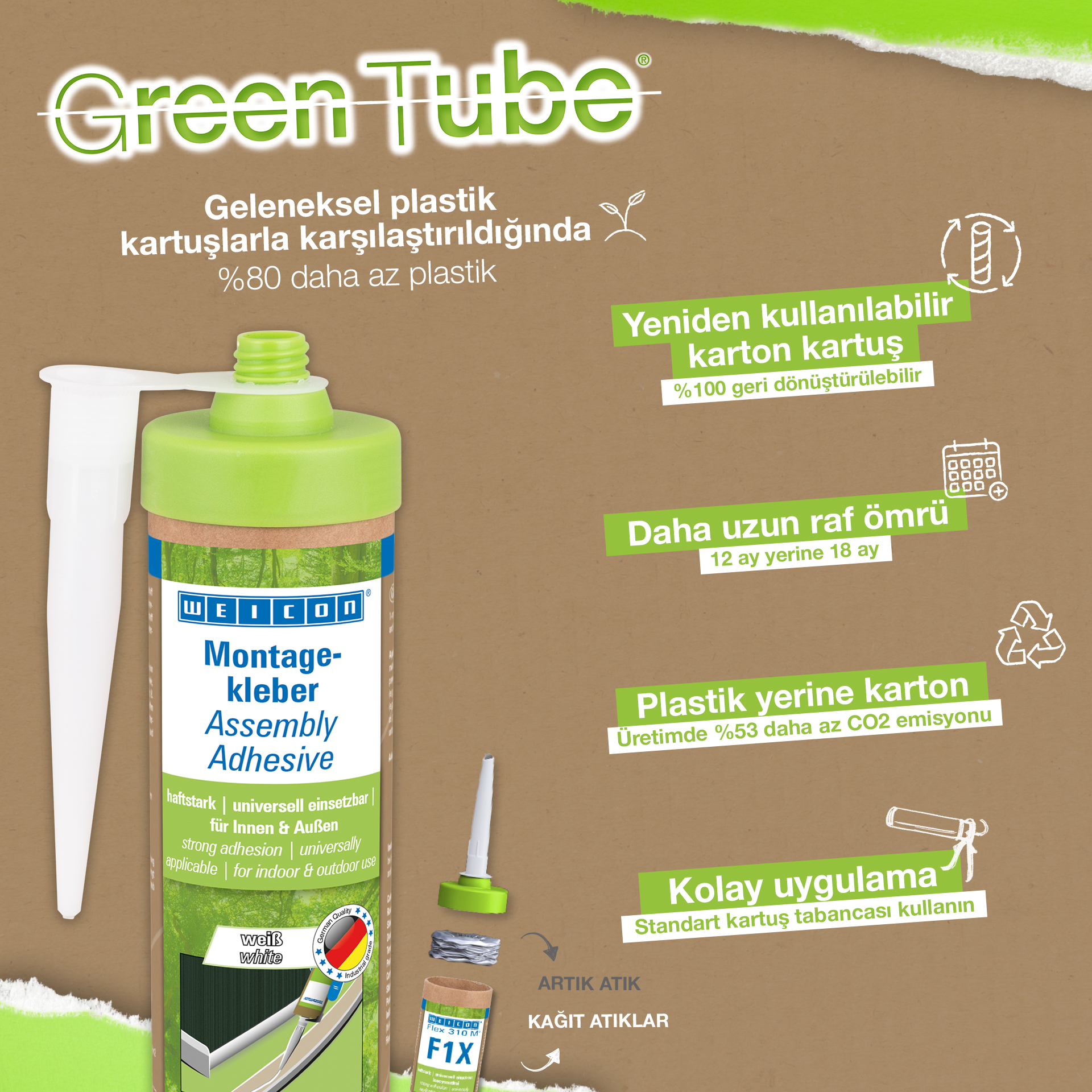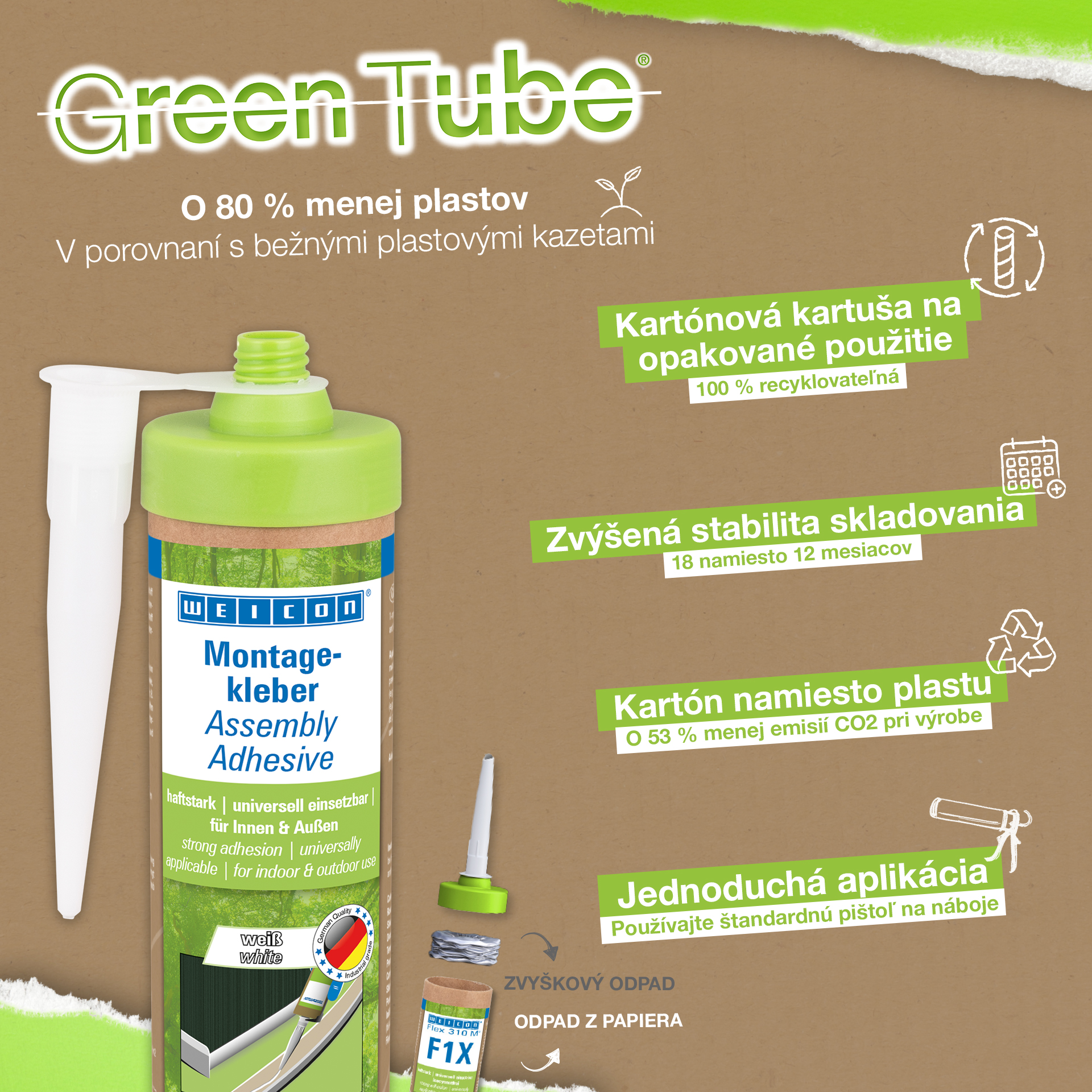 WEICON Montážne lepidlo je silné disperzné akrylátové lepidlo na montáž, opravy a retušovanie. Lepidlo má vysokú počiatočnú priľnavosť a konečnú pevnosť a rýchlo vytvrdzuje. Po zaschnutí sa Montážne lepidlo môže prebrúsiť a omietnuť a môže sa natrieť bežne dostupnými farbami a lakmi. Lepidlo je odolné proti teplotám v rozsahu od -20 °C do +80 °C a je vhodné na použitie v interiéri aj exteriéri. Biele flexibilné lepidlo má nízke emisie a neobsahuje rozpúšťadlá. Montážne lepidlo je univerzálne použiteľné a možno ho použiť na širokú škálu aplikácií. Je ideálny napríklad na povrchové lepenie materiálov na báze dreva (ako sú soklové lišty, dekoračné lišty, panely alebo drevotrieskové dosky), PVC, polystyrénu, penového polystyrénu, tuhej PU peny (napr. izolačné dosky a káblové kanály), minerálnych materiálov (napr. dlaždíc) a kovov na savé podklady, ako sú omietky, betón, vláknocement, sadrokartón a neošetrené drevo. Udržateľne balené - rovnako silné! Green Tube, udržateľné balenie: dýza a uzáver sú vyrobené zo 100 % recyklovaného plastu a telo náplne je vyrobené zo 100 % kartónu. Nižšie emisie CO₂ a nižšia spotreba plastu ako pri bežných náplniach. Bez kompromisov vo výkone!