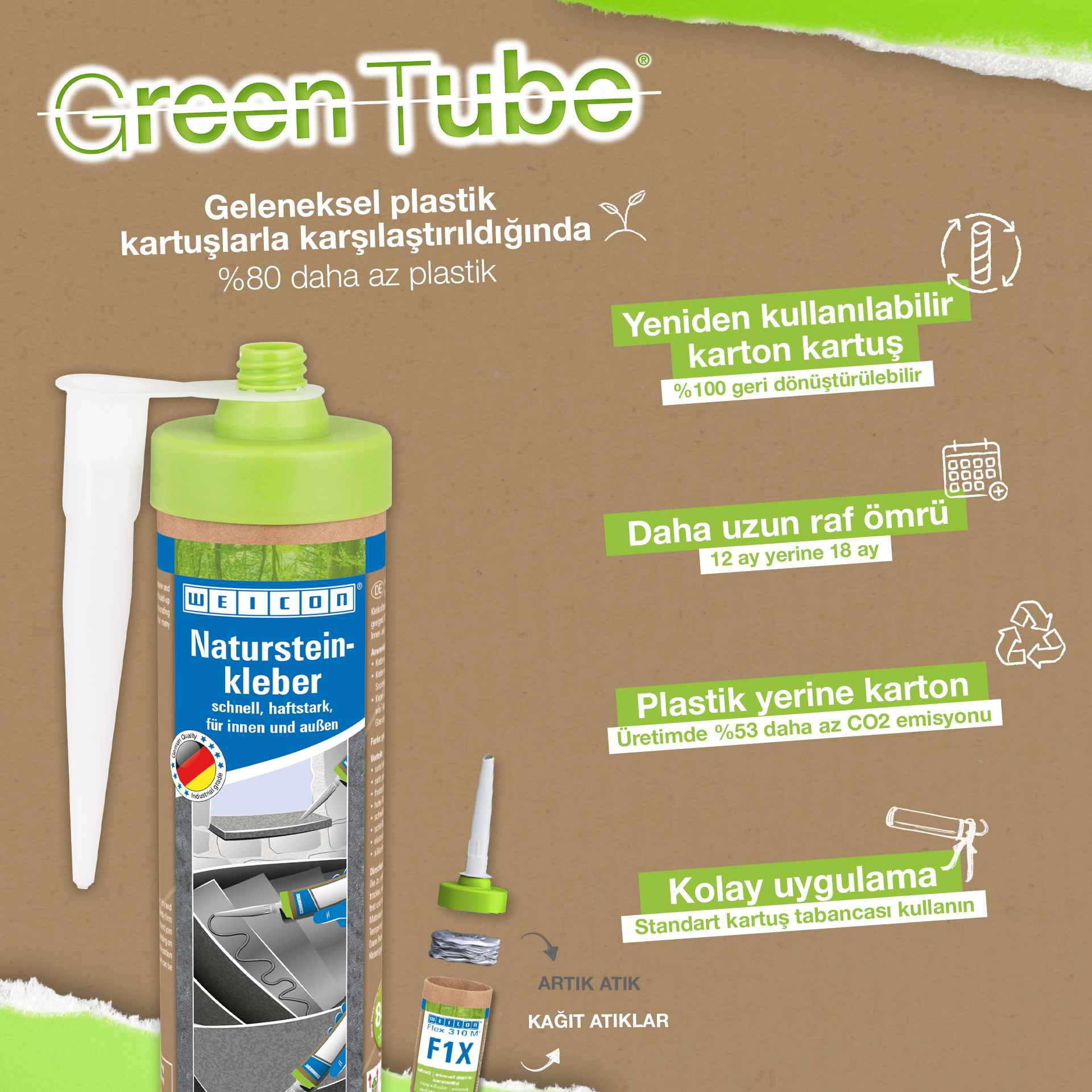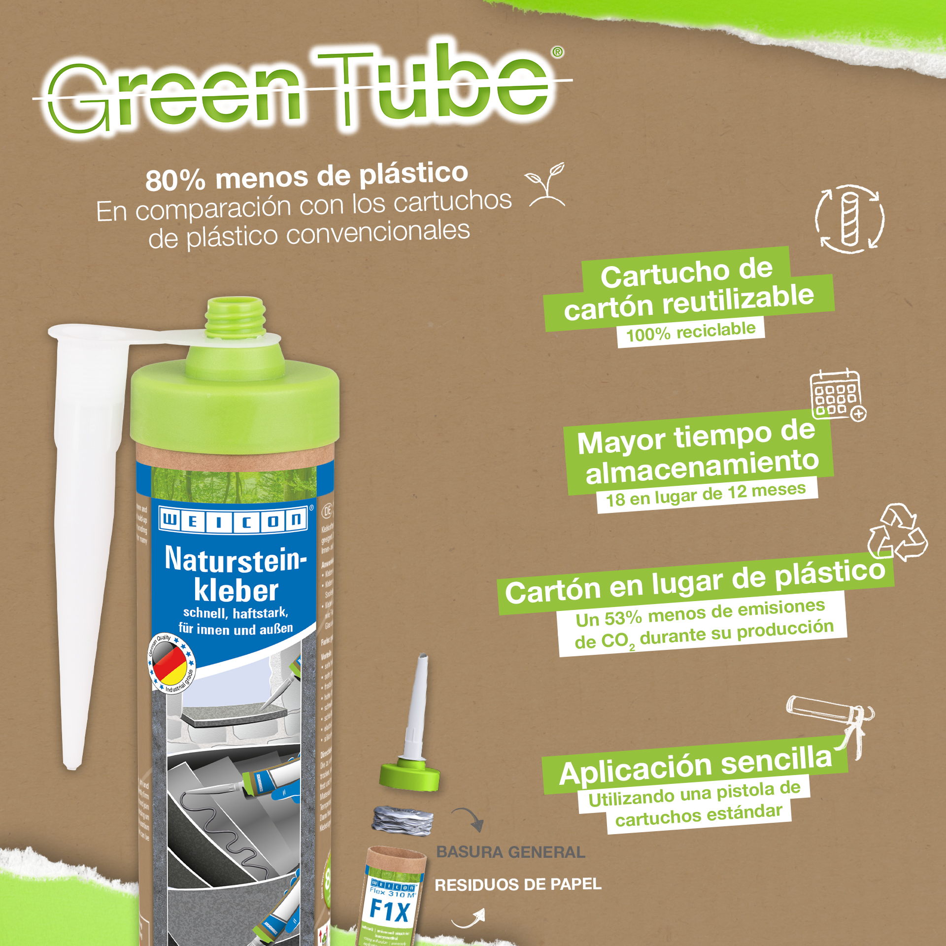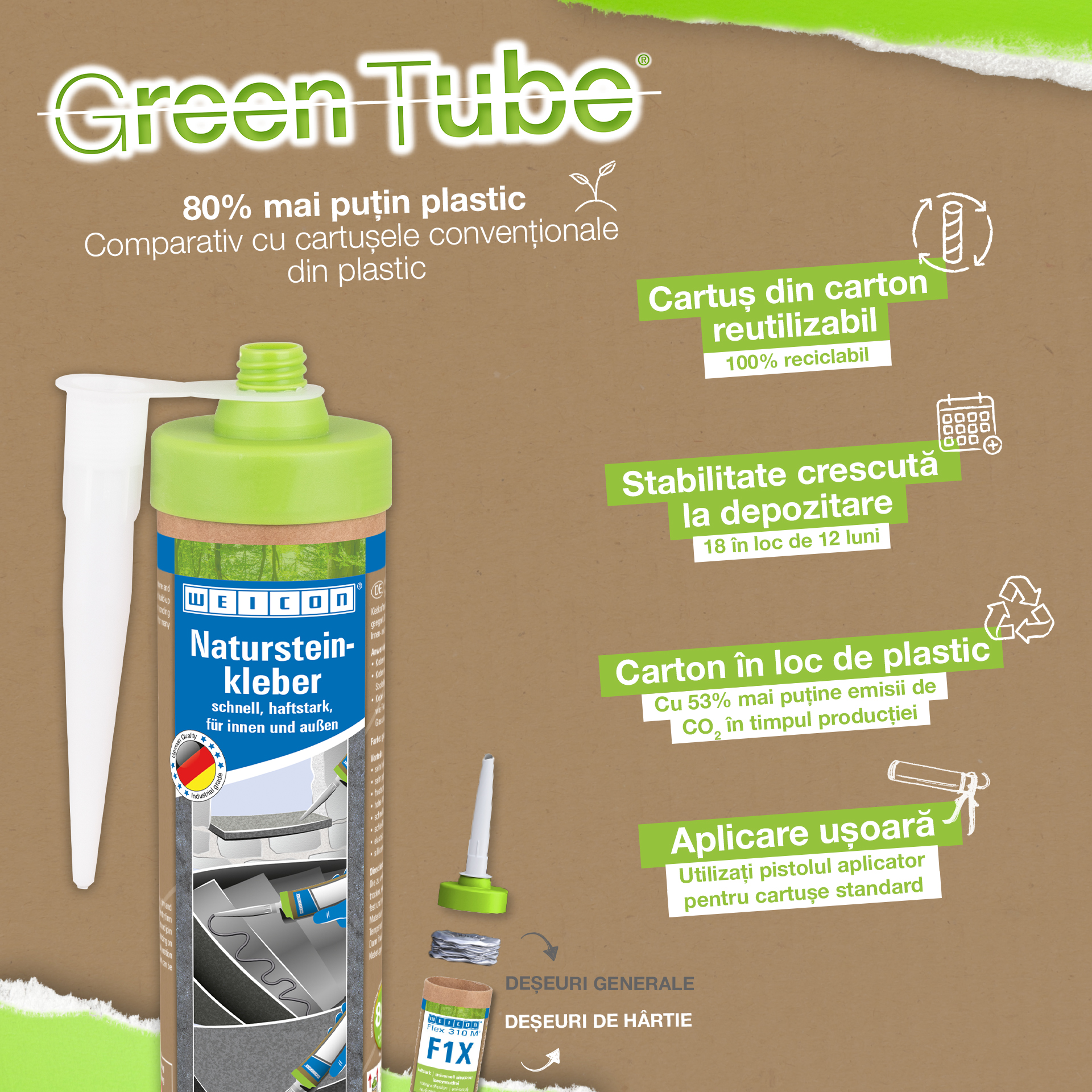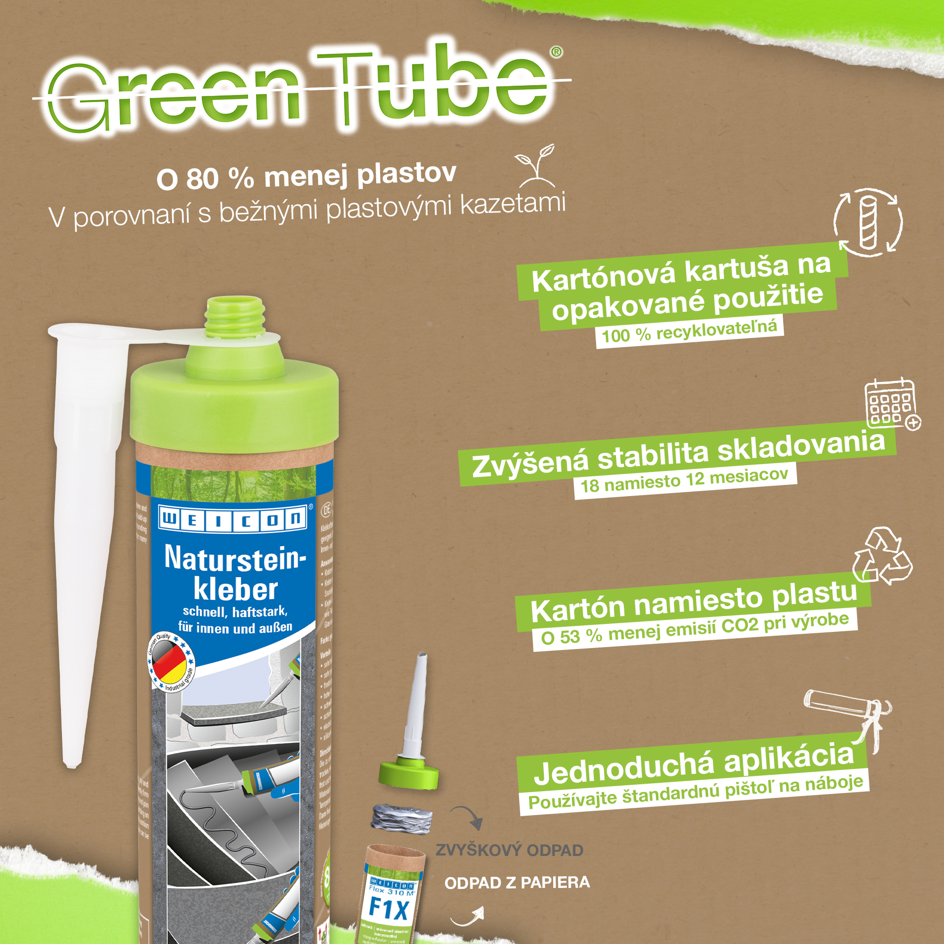 WEICON Lepidlo na prírodný kameň je silné lepidlo na inštaláciu prírodného kameňa, kameňa a keramiky. Vďaka veľmi vysokej počiatočnej priľnavosti a rýchlemu nárastu pevnosti lepidla je možné lepiť aj na zvislé povrchy, ako sú steny. Lepidlo na prírodný kameň je vhodné na mnohé vnútorné aj vonkajšie aplikácie. Je mrazuvzdorné, má vysokú teplotnú odolnosť od -40 °C do +90 °C, ako aj vysokú odolnosť proti poveternostným vplyvom a UV-žiareniu. Lepidlo na prírodný kameň rýchlo tvrdne a má veľmi vysokú konečnú pevnosť. Po vytvrdnutí sa lepidlo môže brúsiť a zostáva pružné, aby kompenzovalo pohyb. Lepidlo na prírodný kameň neobsahuje silikón, izokyanát, halogény ani rozpúšťadlá. Dá sa použiť v širokej škále aplikácií - či už na lepenie okenných parapetov, obkladačiek, soklových líšt, podlahových líšt, ozdobných líšt alebo schodiskových stupňov. Lepidlo WEICON na prírodný kameň veľmi dobre priľne k širokej škále materiálov, ako je drevo, materiály na báze dreva, plasty, kovy, sklo a minerálne podklady. Je k dispozícii v sivej a bielej farbe.