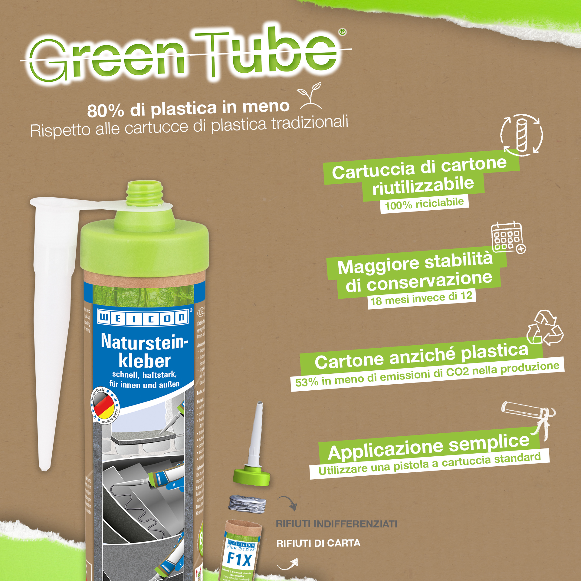 WEICON Lepidlo na prírodný kameň je silné lepidlo na inštaláciu prírodného kameňa, kameňa a keramiky. Vďaka veľmi vysokej počiatočnej priľnavosti a rýchlemu nárastu pevnosti lepidla je možné lepiť aj na zvislé povrchy, ako sú steny. Lepidlo na prírodný kameň je vhodné na mnohé vnútorné aj vonkajšie aplikácie. Je mrazuvzdorné, má vysokú teplotnú odolnosť od -40 °C do +90 °C, ako aj vysokú odolnosť proti poveternostným vplyvom a UV-žiareniu. Lepidlo na prírodný kameň rýchlo tvrdne a má veľmi vysokú konečnú pevnosť. Po vytvrdnutí sa lepidlo môže brúsiť a zostáva pružné, aby kompenzovalo pohyb. Lepidlo na prírodný kameň neobsahuje silikón, izokyanát, halogény ani rozpúšťadlá. Dá sa použiť v širokej škále aplikácií - či už na lepenie okenných parapetov, obkladačiek, soklových líšt, podlahových líšt, ozdobných líšt alebo schodiskových stupňov. Lepidlo WEICON na prírodný kameň veľmi dobre priľne k širokej škále materiálov, ako je drevo, materiály na báze dreva, plasty, kovy, sklo a minerálne podklady. Je k dispozícii v sivej a bielej farbe.