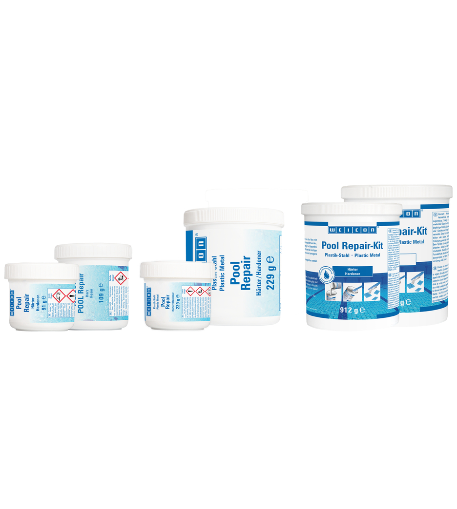WEICON Súprava na opravu bazénov je vhodná najmä na rýchle opravy pod vodou. Veľmi dobrá priľnavosť umožňuje spracovanie na mokrých povrchoch. Rýchle vytvrdzovanie podporuje napríklad opravy obkladačiek, dlaždíc a mozaiky.