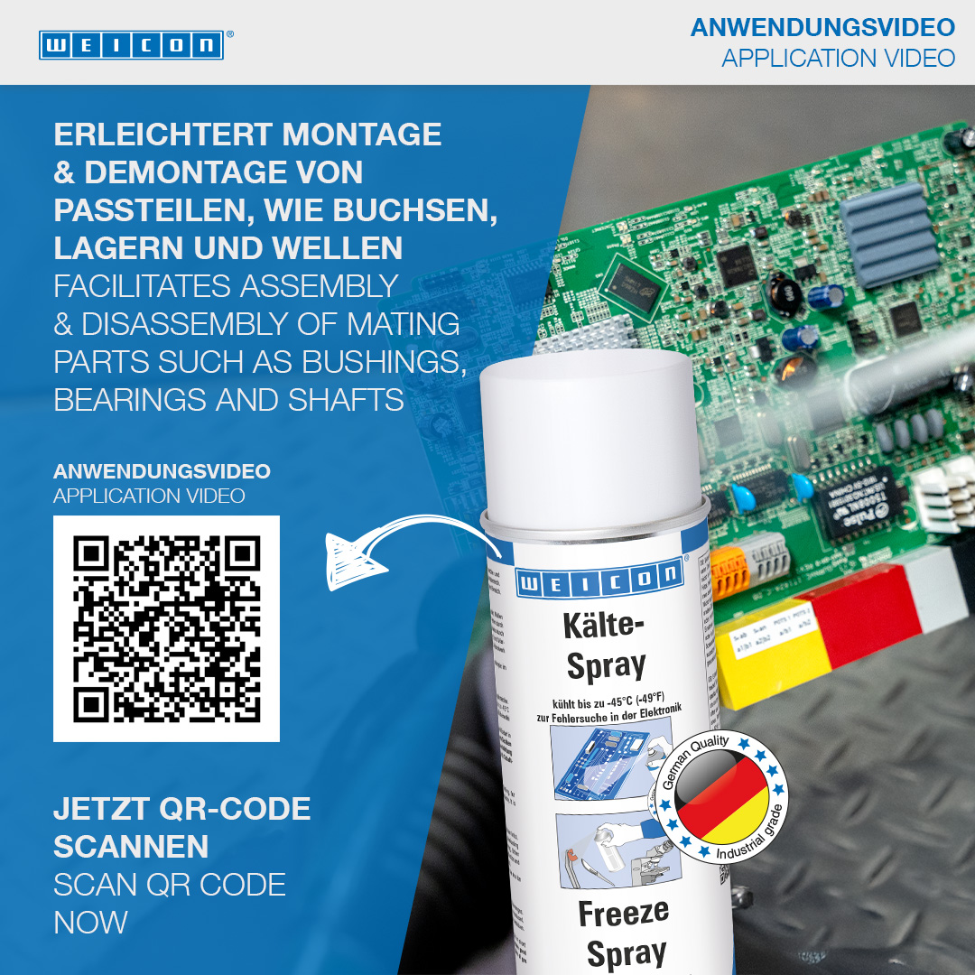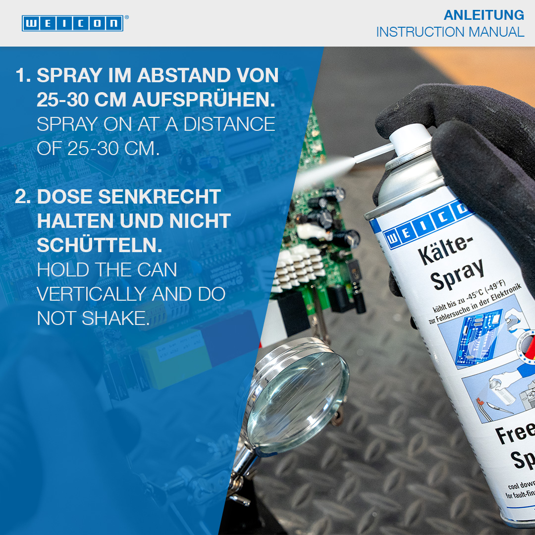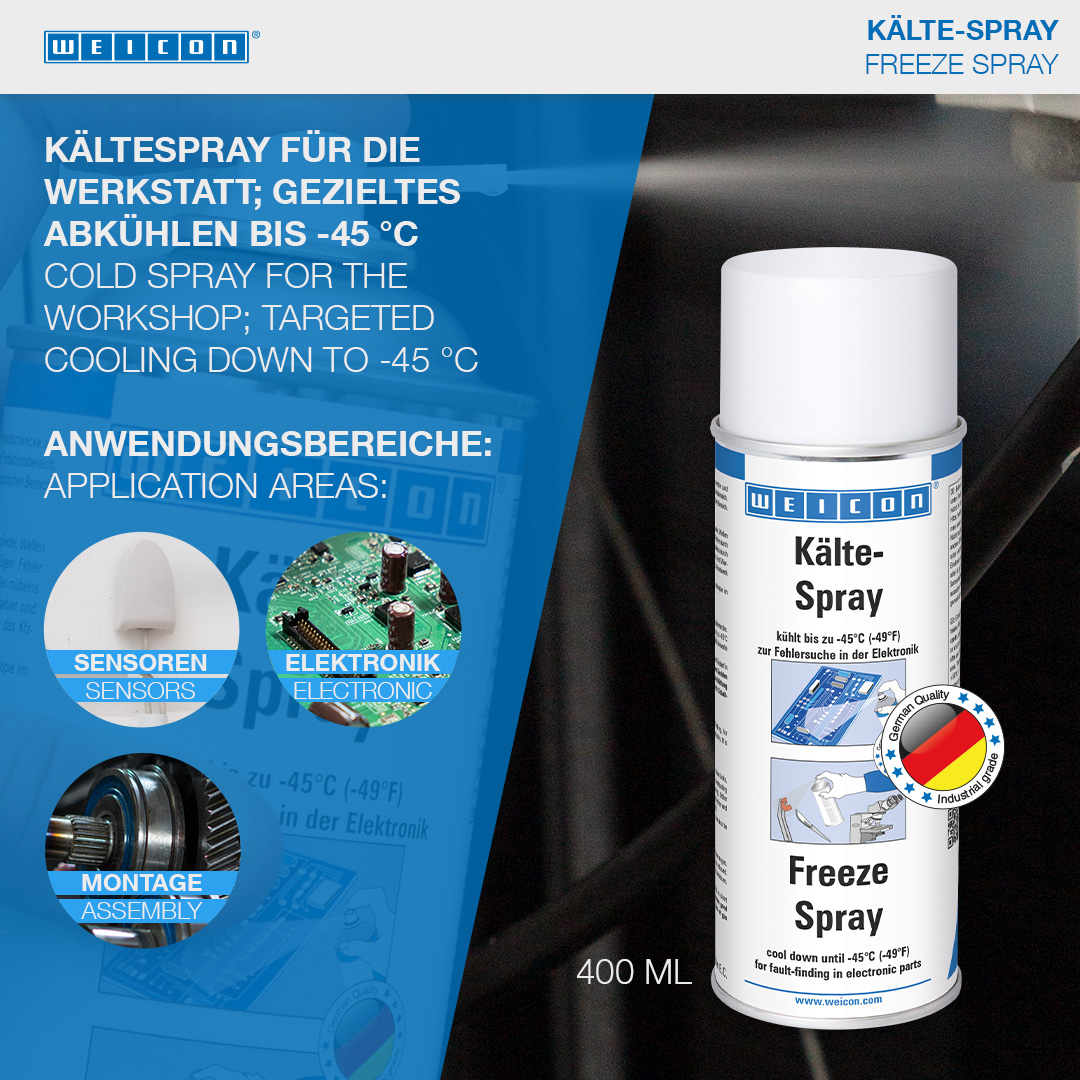 WEICON Zmrazovací sprej ponúka mnohostranné využitie, napr. pri vyhľadávaní porúch v elektronike, alebo pri opravách v priemyselných odvetviach. Zmrazovací sprej rýchlo ochladzuje obrobky na -45 °C a umožňuje tiež cielené schladenie aj najmenších súčastí. WEICON Zmrazovací sprej je nevodivý a neutrálny k materiálom (mimo plastov) a možno ho používať v mnohých oblastiach techniky a priemyslu.